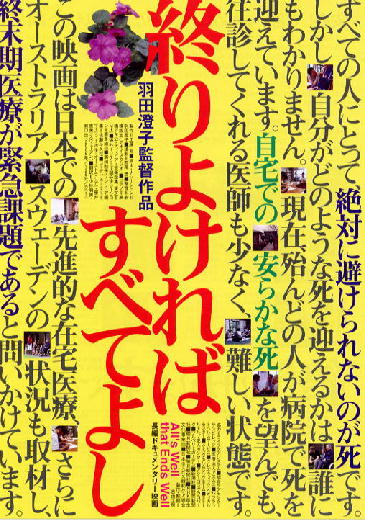 自分の死をどう迎えるか、いかに死ぬか……。どの人にとっても、考えておかなくてはいけない大切な問題です。羽田澄子監督は、「“ターミナルケア”は、今早急に取り上げるべき問題だ」と、通常だったら映画作りに1年から2年かかるのですが、この「終わりよければすべてよし」は、たった5か月で作り上げたそうです。