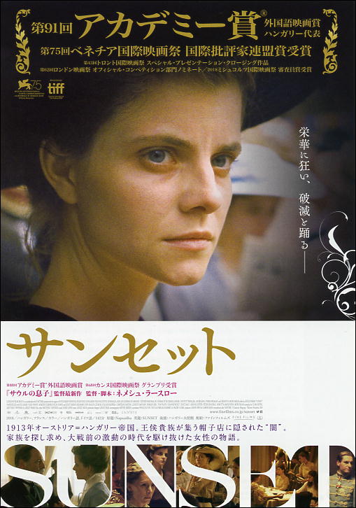 何が起きているのかつかめないでいるおびえた目、何かを悟り突き進んでいく何者をも寄せ付けない鋭い目、突然の火花と銃声、喧噪に驚く空に浮いた目。主人公イリスのまなざしが気になります。さらに、主人公の表情を画面いっぱいに捕らえ、または彼女の肩越しに据えられたカメラが、彼女の目の前で起きていることを追っていきます。レースがふんだんに使われている華麗なドレス。これらの特徴が織りなす独特の雰囲気が、日本ではめずらしいハンガリー映画「サンセット」を、他の作品とは違う魅力的な作品に仕上げました。本作は、ハンガリーからアカデミー賞に送る外国映画賞のハンガリー代表となりました。