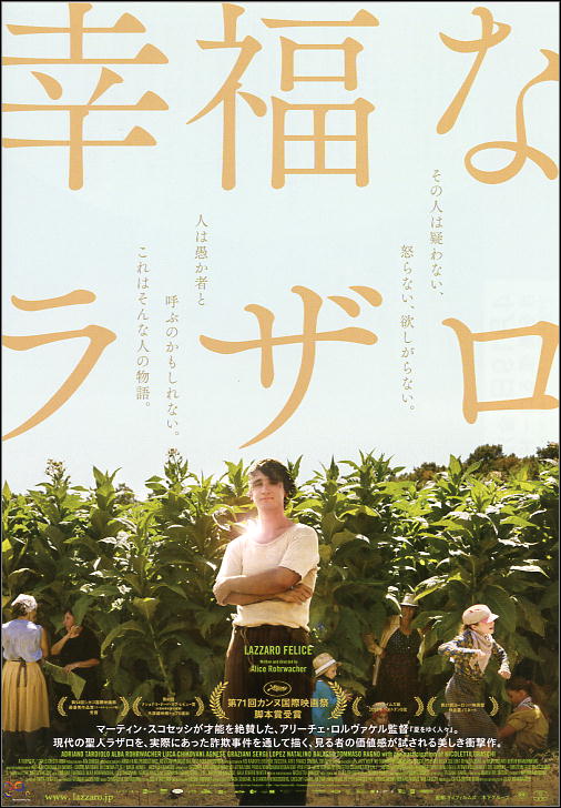 そんなラザロをイメージした映画「幸福なラザロ」に登場するラザロ(アドリアーノ・タルディオーロ)は、イタリアの小さな村で寡黙に働く貧しい農夫です。たばこ農園の小作農家たちの間で働いていますが、ひとりぼっちのラザロは彼らに都合よく使われているほとんどしゃべらない青年です。いつも薄汚れた服を着て、暑いときも、雪が降る寒いときも同じ格好です。いつも、目を見開いています。悪く言えば小作人たちにこき使われており、よく言えば、子どもから高齢者までが安心して彼を受け入れ、なんでも頼める若者です。村人たちの輪の外側にいて、目立たちません。小間使いのように働き、危険で、体力を必要とする汚くきつい仕事をさせられています。ラザロは、だれから頼まれても、快くすぐ行動します。