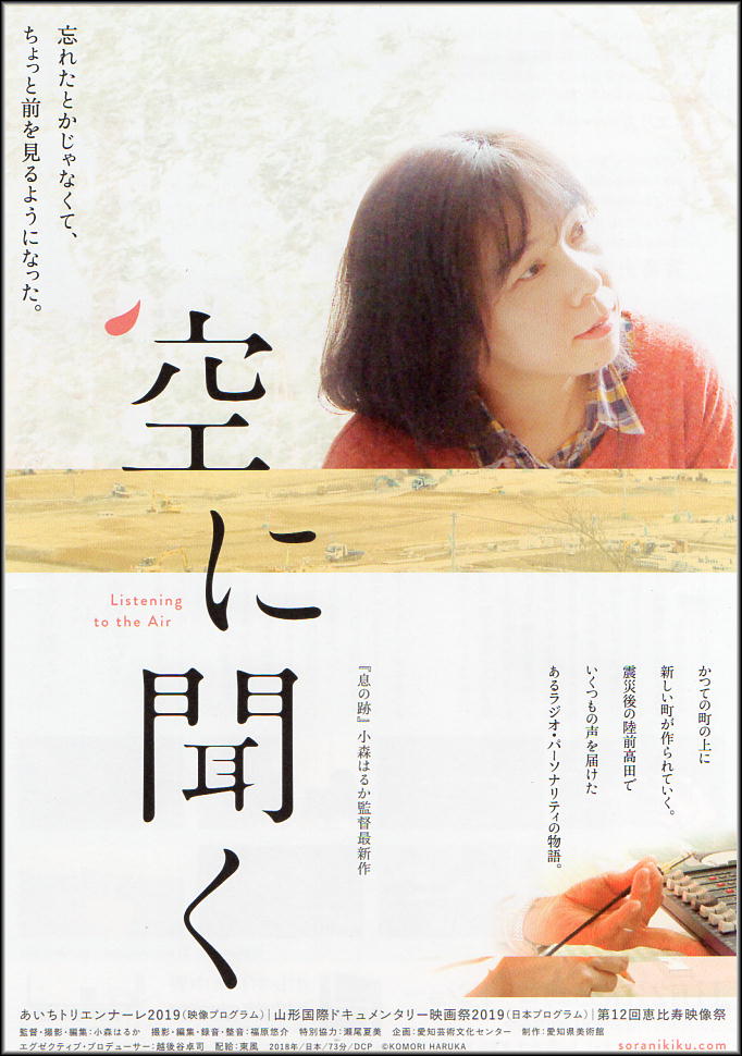 東日本大震災の後、被災地ではいくつかのFM放送が立ち上がり、被災地の人々に生活情報や心に寄り添う内容の発信をしてきました。阿部裕美さんは、2011年12月10日から、陸前高田市の市民に向けて語り始めました。映画「空に聞く」は、阿部裕美さんの番組取材の様子を追ったドキュメンタリーです。阿部さん自身も、和食のお店を開いていましたが、お店も実家も津波に流されてしまいました。自分の生活も整わない中、阿部さんは、パーソナリティーになりました。