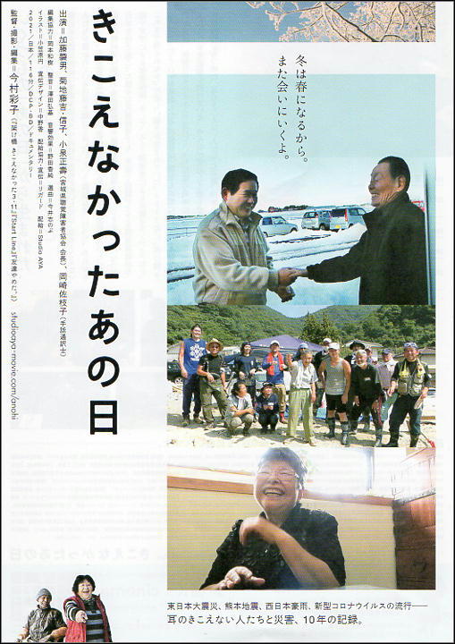 今年は、東日本大震災から10年を迎えます。ボランティア活動なども一区切りするところもあり、震災は遠くなりつつあります。あのときの音のない世界で暮らしていた人々は、津波が押し寄せる中を、どのようにしていのちを救ったのでしょうか。10年が経った今、彼らはどのように暮らしているでしょうか。あのとき、音が聞こえない今村監督は、津波を知らせる警報が聞こえず、津波にのみ込まれていたかもしれないと言っています。震災の直後に避難所で取材した人々は、10年経った今、どのように暮らしているのでしょうか。ドキュメンタリー映画「きこえなかったあの日」は、耳の聞こえない人たちと災害を追った10年の記録です。
