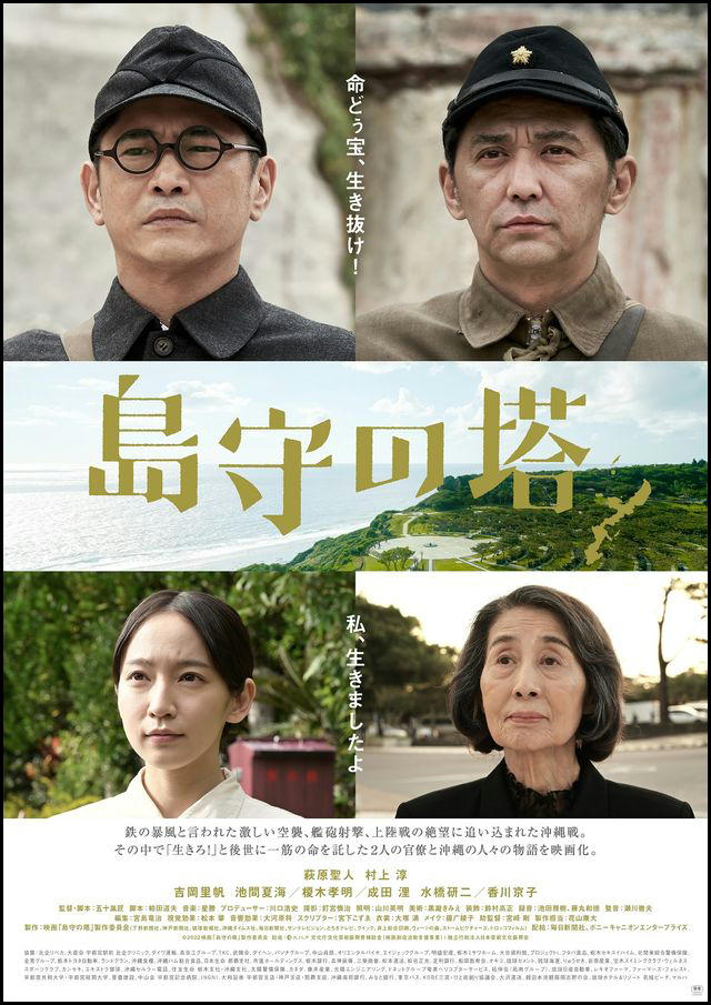 日本の第2次世界大戦では、戦地に赴いた兵士ばかりでなく、国土でも空襲や原爆投下で多くの人々が苦しい思いをしましたが、海を隔てた沖縄の人々も、「本土を守る」ために犠牲を強いられました。米軍の上陸を受けた沖縄本島南端の摩文仁の丘には、世界の恒久平和を願って平和祈念公園ができ、海に向かう断崖の上には、沖縄戦で亡くなった24万人余りの人々の名前が刻まれた「平和の礎」が並んでいます。その右手、小高くなった丘には、各都道府県や団体の慰霊碑が建てられていますが、その道の入口にあたるところに「島守の塔」があります。激戦地となる沖縄に知事として派遣された島田叡知事と、島田知事と一緒に住民を守った荒井退造沖縄県警察部長の終焉の地に建てられました。映画「島守の塔」は、この2人をとおして、激しくなっていく沖縄戦、また米軍上陸の恐怖の中で翻弄される沖縄の人々を描いた作品です。