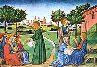 19節では弟子たちではなく、イエスご自身が群衆に命じて彼らを座らせておられます。続く19節後半の所作は、すべてイエスご自身の行為です。人が本当に養われるのはイエスのもとであって、イエス不在の人里ではないことを象徴していると言えるかもしれません。なお、イエスが「パン……を取り、天を仰いで賛美の祈りを唱え、パンを裂いて」という表現に注目しましょう。あとで最後の晩餐の記事(26.26~30)を読むとき、わたしたちは文字どおりこの言葉に出合います。著者は意図的にそのように書いていると思われますが、そのことについては26章を読むときに見ることにします。マタイはこのイエスの姿に、主の晩餐のときのイエスを反映させています。その証拠のひとつに、彼はこの場面でもはや二匹の魚にはまったく触れていません。