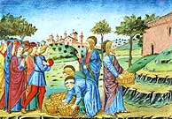 イエスはパンを裂かれますが、裂いたパンを直接配ることはされず、弟子たちにお渡しになりました。イエスからパンをいただいた弟子たちは、そのパンを群衆に渡します。イエスの行為と同じ動詞が弟子たちの場合にも用いられていますが、ここにマタイの理解した弟子たる者とは何かがよく示されています。イエスの弟子であるということは、イエスに心酔し、イエスの恵みを受けて幸せであるだけのことではありません。弟子とはキリストから受けたものを大切に受け止め、確かに人々に受け渡す使命を持つ者なのです。