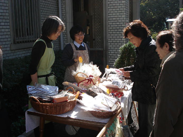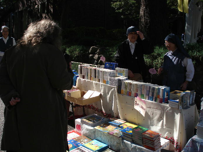 日用雑貨、衣料品、女子パウロ会の作品、手芸品、特選コーナーなど、修道院のホールと庭のあちこちにコーナーが設けられ、シスターたちが立ちました。