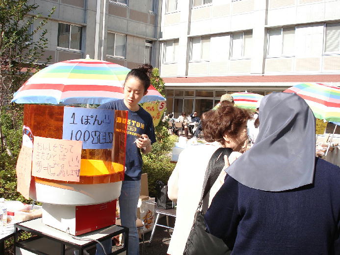 食堂の横には喫茶販売が設けられ、窓をカウンターのようにして販売しました。レモングラスのハーブティーからよい香りが流れ、4杯も飲んでくださった方がいらっしゃいました。その向かいには綿アメとウーロン卵、シスター特製のケーキなどが並びました。綿アメは自分で作れるとあって、みなさん割り箸を回しながら楽しんでくださいました。