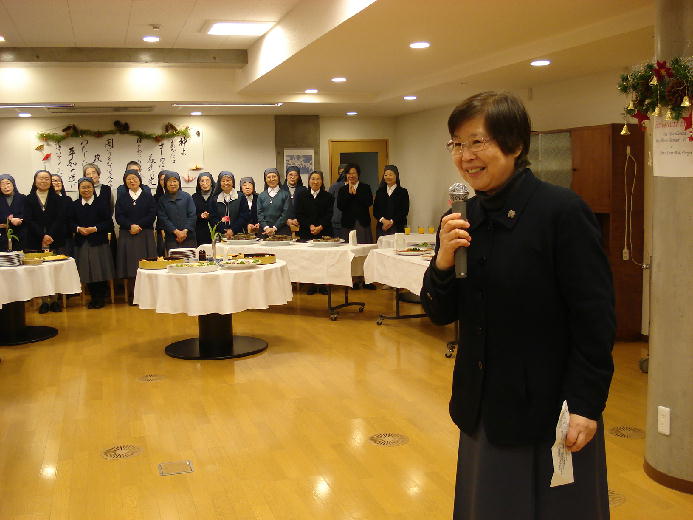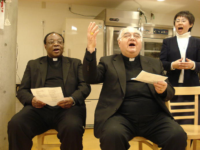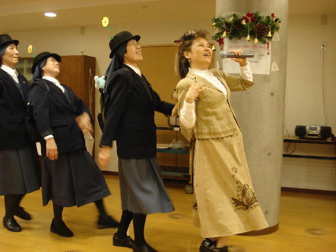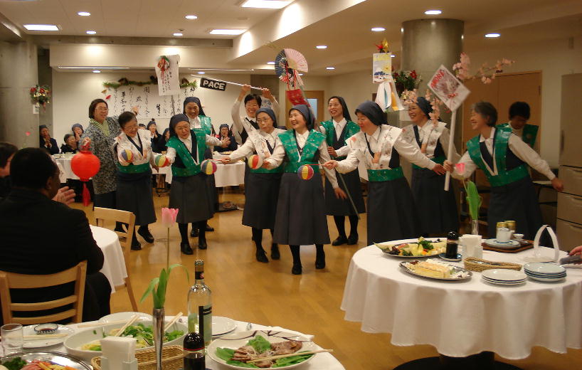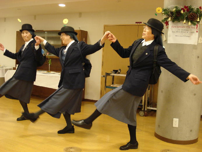 日本酒がお好きなお二人はおちょこで、わたしたちはビールとジュースで乾杯しました。夕食をいたただきながらしばらく歓談した後で、お二人を歓迎して、小さな出し物をしました。「サイド・バイ・サイド」の歌に合わせて、歌い手のリーダーといっしょに、3人のシスターがちょっときどって踊りました。「えっ、いつ練習したの?」ハイネのような帽子も決まって、なかなかのものでした。