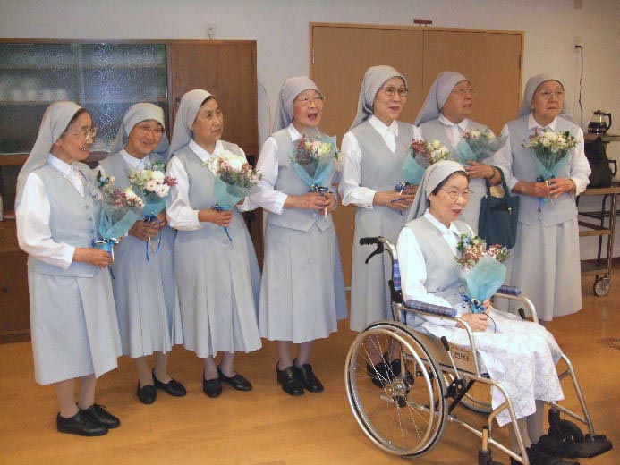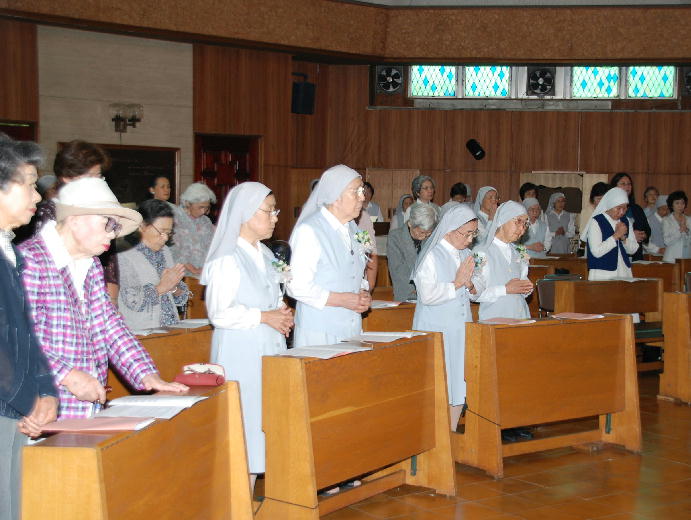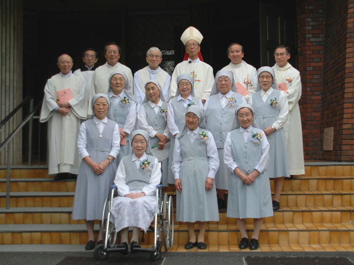 1955年、創立者のヤコブ・アルベリオーネ神父と共同創立者であり総長のSr.テクラ・メルロが日本を訪問したときに着衣をし、1958年、Sr.イレネ・コンティが管区長のときに、日本管区の4期生として初誓願を立てました。 あれから50年、神の恵みとみなさまのご指導のお陰で歩んできました。今日を新たな出発点として、召命に忠実に歩んでいきたいと思います。