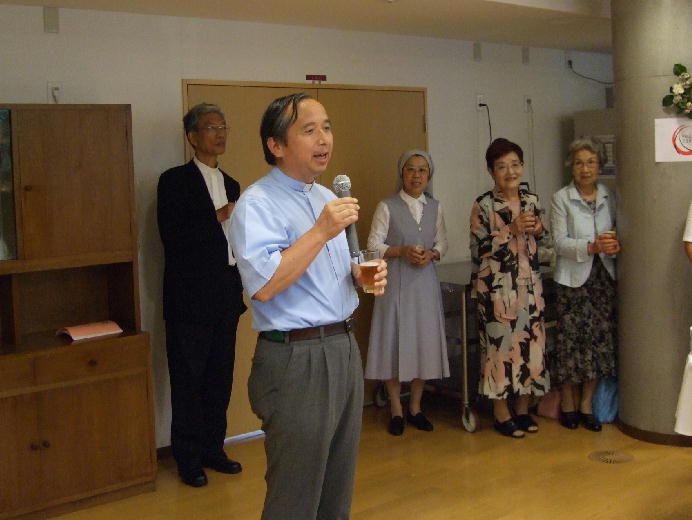 | 乾杯の音頭をとる山内神父 | お祝いのあいさつをしてくださる岡田大司教 |