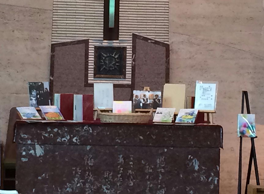 「あけぼの原画展」と対談、講演会を終え、5月15日からはじまった「あけぼの感謝ウィーク」は、24日(日)の夕方、終了しました。翌日の25日(月)の朝、わたしたちは聖堂に集まり、月刊誌「あけぼの」との最後の別れの祈りをしました。祭壇の周囲には、「あけぼの」の歴史を年表にしたパネルを並べ、執筆者、購読者、編集に携わった人々、表紙を描いてくれた人々、普及に携わった人々、点字・音訳・封筒入れなどをしてくださったボランティアの方々を思い起こして祈りました。最後に、わたしたちひとりひとりが抱いている「あけぼの」への思いを紙に書いて祭壇にささげました。