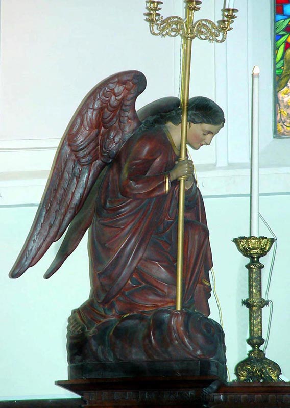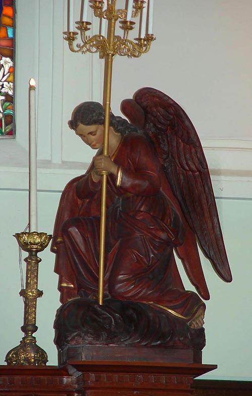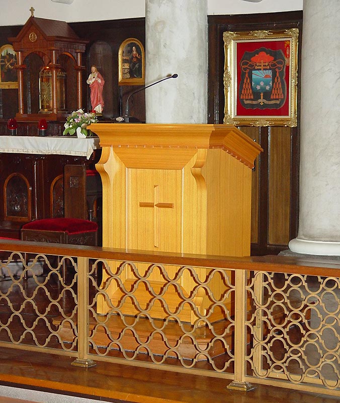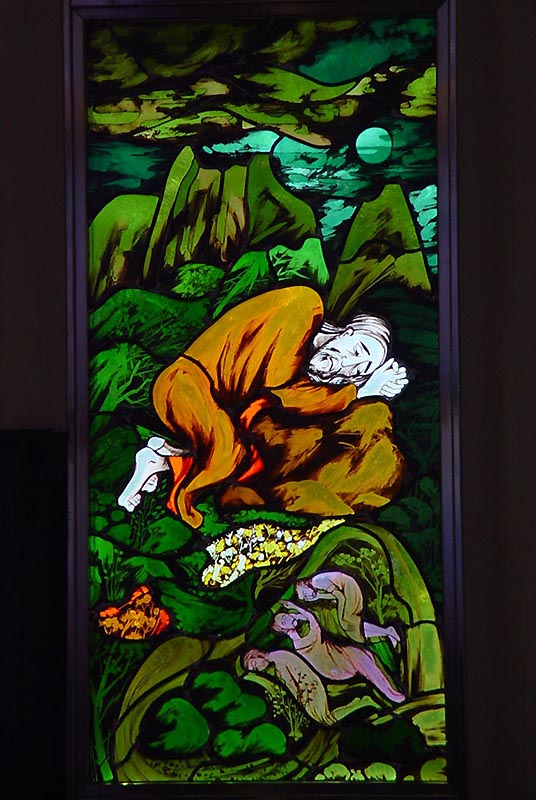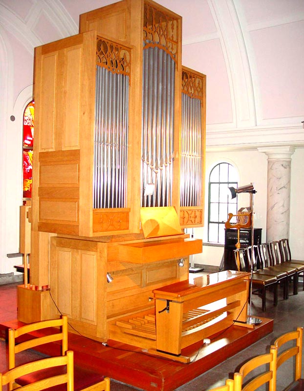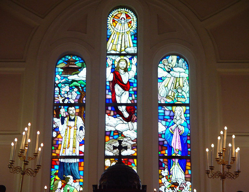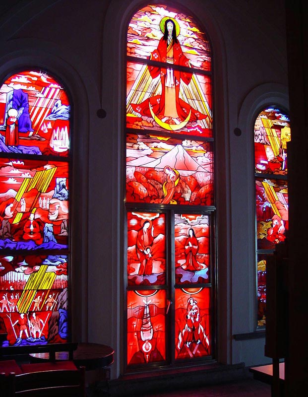 2階の聖歌隊席の後ろには、和服姿のマリアと長崎26人殉教者をはじめとする日本のキリスト教会史と殉教者たちが描かれたステンドグラスがあり、そこから、やさしい光が差し込んでいます。