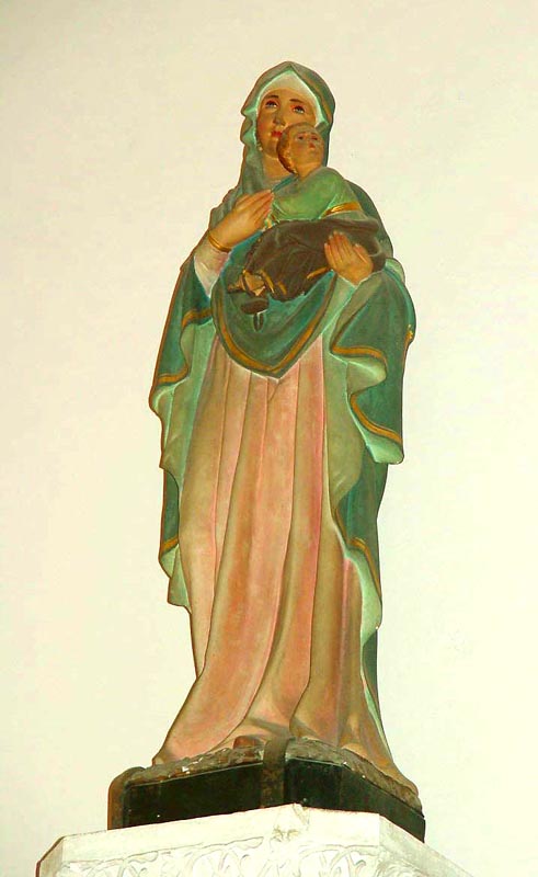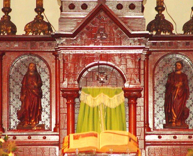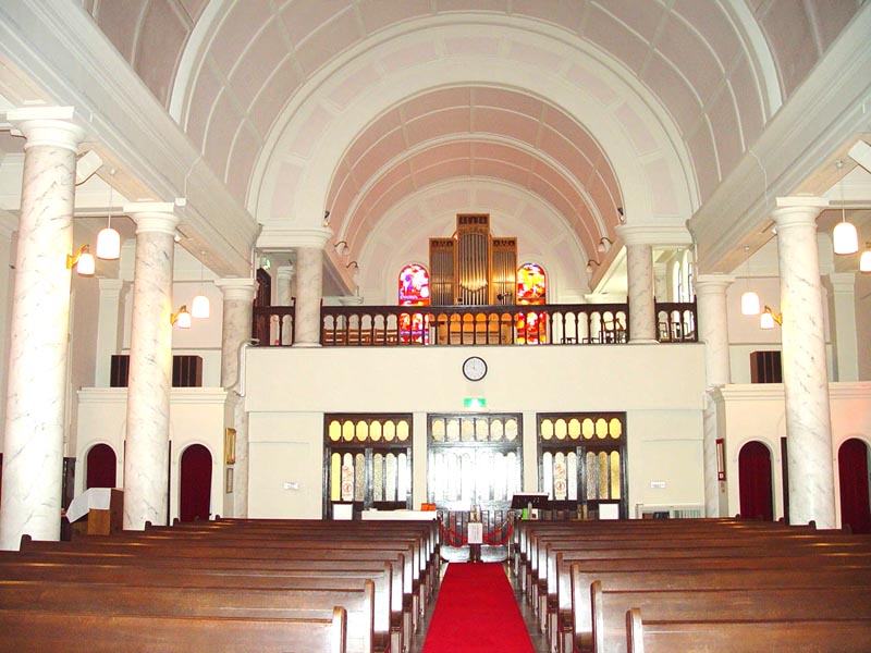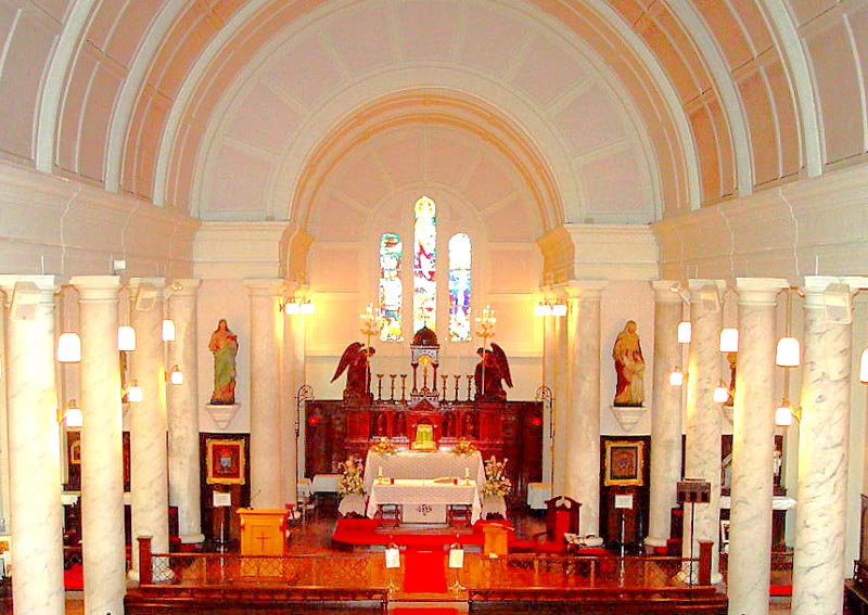 聖堂内の正面には、三位一体の神、聖フランシスコ・ザビエルが、両方の壁には、天地創造や受胎告知、聖霊降臨などの聖書が描かれています。