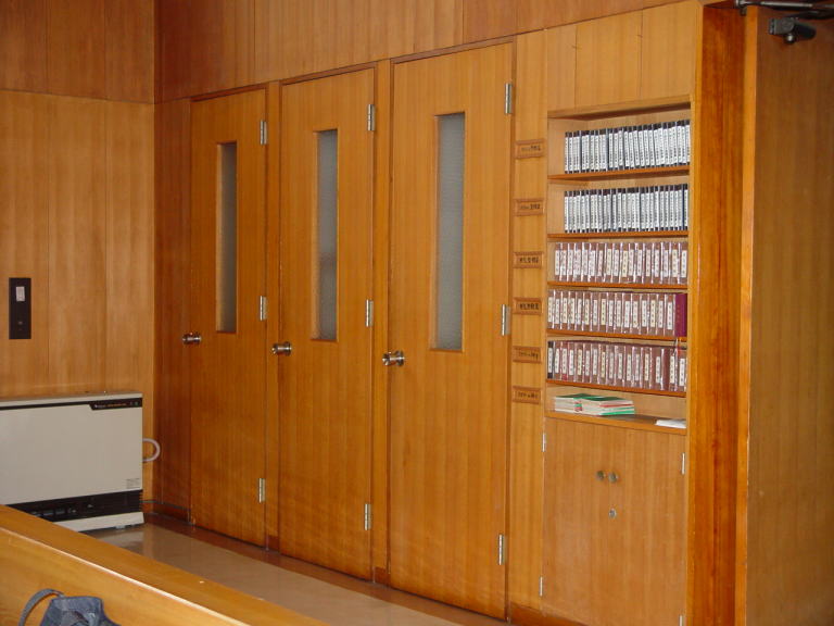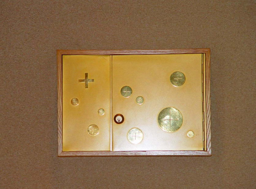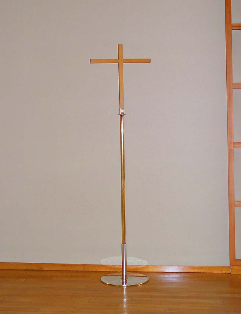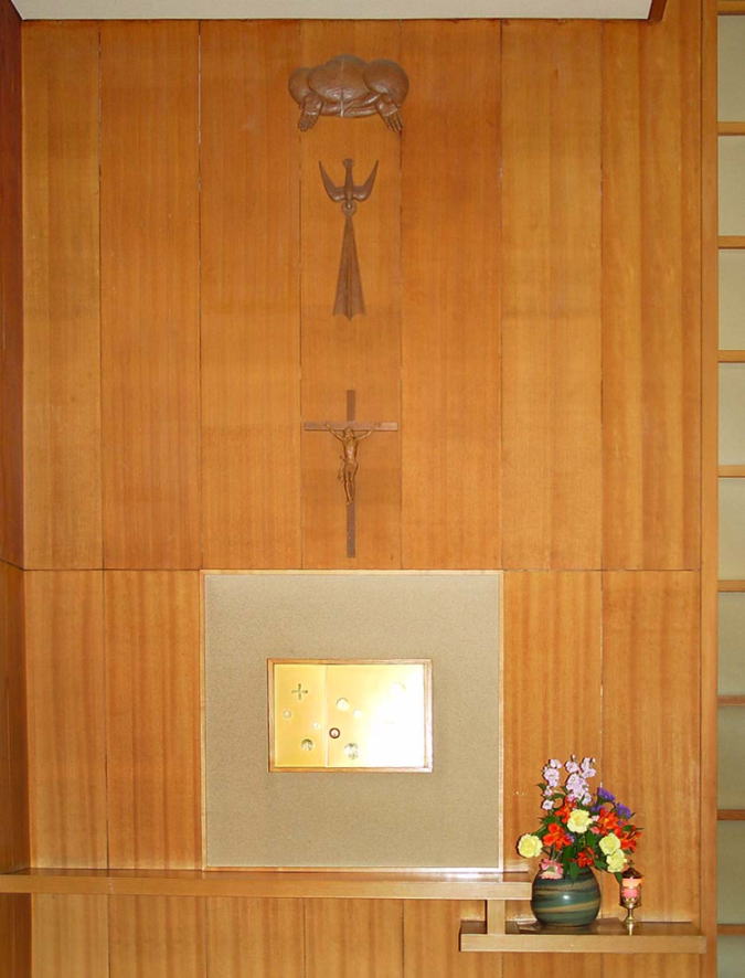 この聖堂の特徴のひとつに、とてもシンプルであることがあげられるでしょう。カロン神父は、他の教会のためにはたくさんのステンドグラスを製作なさっておられますが、この赤堤教会には、ステンドグラスはありません。祭壇正面の両脇は、まるで障子のようになっていて、そこに薄黄色のガラスが十字の形に入っているだけです。しかし、日本人にとってとても落ち着いた感じのする聖堂といえるでしょう。
