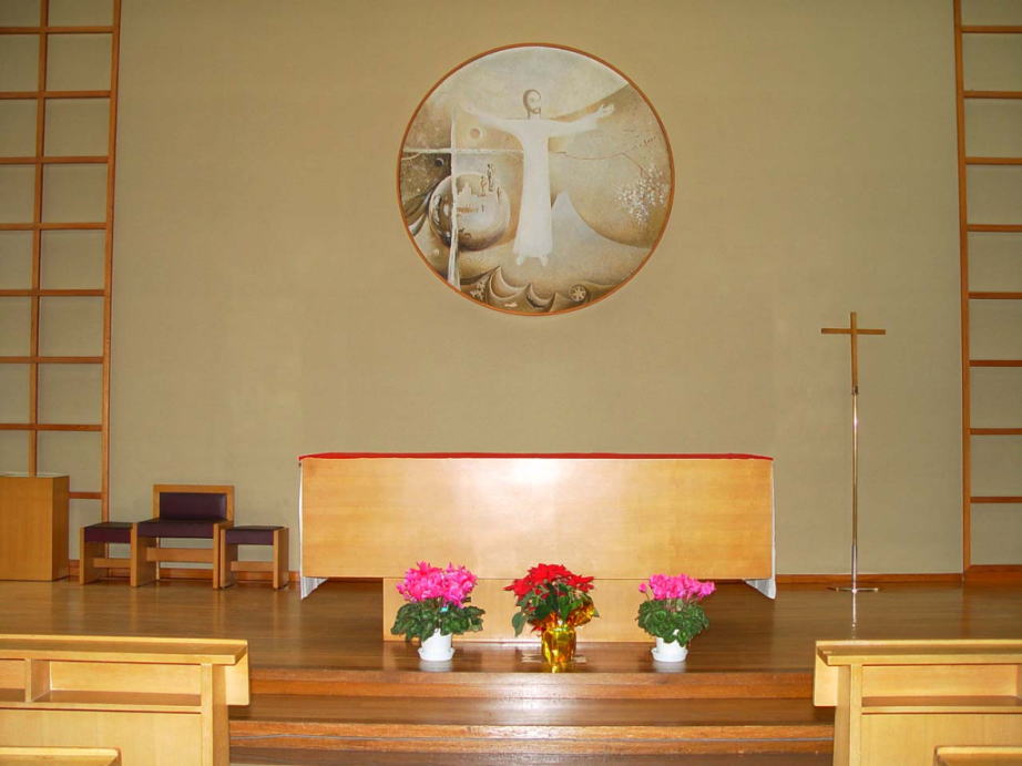 赤堤教会の聖堂は、ケベック宣教会のカロン神父によって設計されました。聖堂正面には、「宇宙のキリスト」の絵があります。地球と富士山をバックに教会堂名でもある「王であるキリスト」が両手を広げて立っておられます。キリストの右手の下には、地球にいる私たち人間、工場、そして十字架があり、左手の下には桜や小鳥たちなど自然が描かれています。キリストの足下には海があり、宇宙万物の王であるキリストがとても日本的に表されているように感じました。