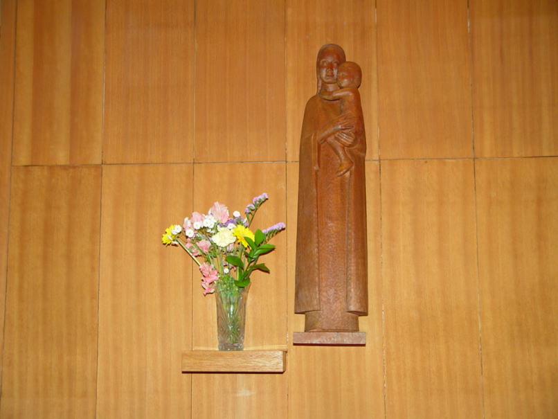 「マリアとイエス」の木彫りの像もカロン神父の作品で、とても温かみのある像です。
