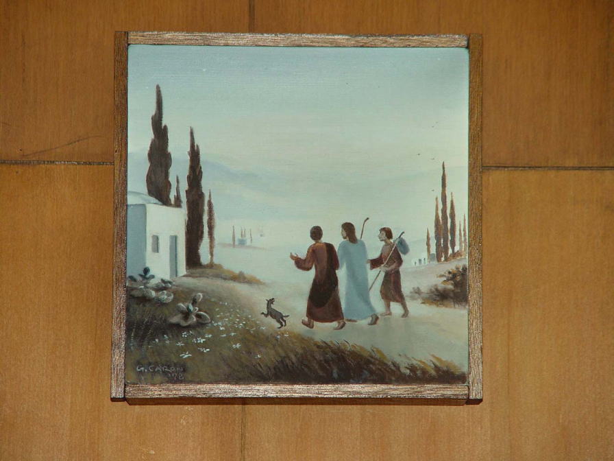 赤堤教会の十字架の道行は、他の教会とは少し違います。13留までしかなく、最後の晩餐(ばんさん)からはじまり、王であるキリストで終わるこの道行は、すべて聖書の箇所からとられています。そのため、イエスのそのみ顔を布に写し報いられたヴェロニカの留はなく、「イエスの復活」や「エマオへの道」が入った特徴のある道行です。