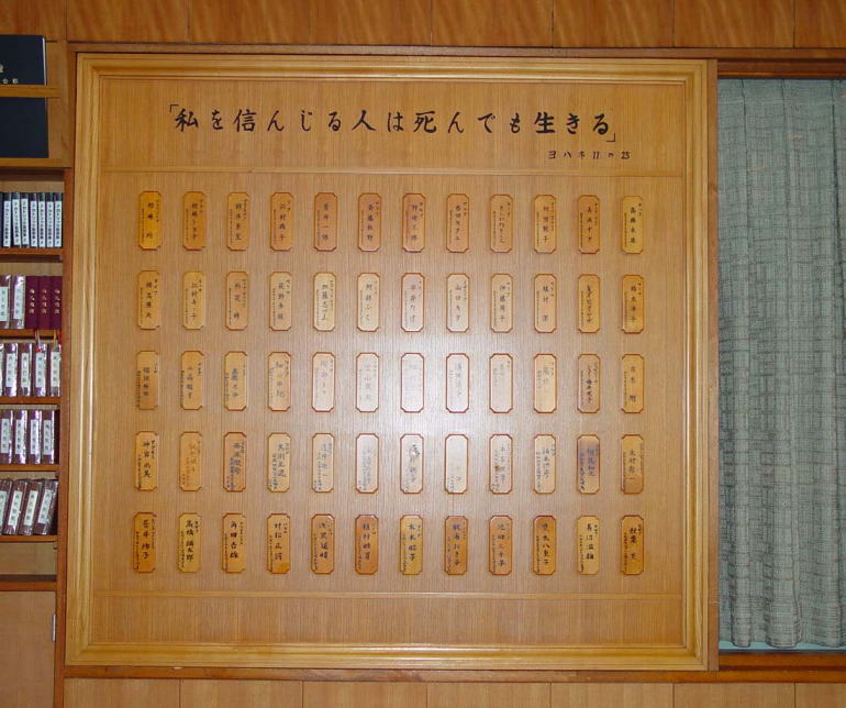 また、聖堂の後ろには先に主の元に旅立たれた多くの信徒の方たちの名前が記されています。聖堂内にあるのはめずらしいことですが、「私を信じる人は死んでも生きる」(ヨハネ 11.25)という聖書のことばを読みながら、とてもふさわしく感じられました。