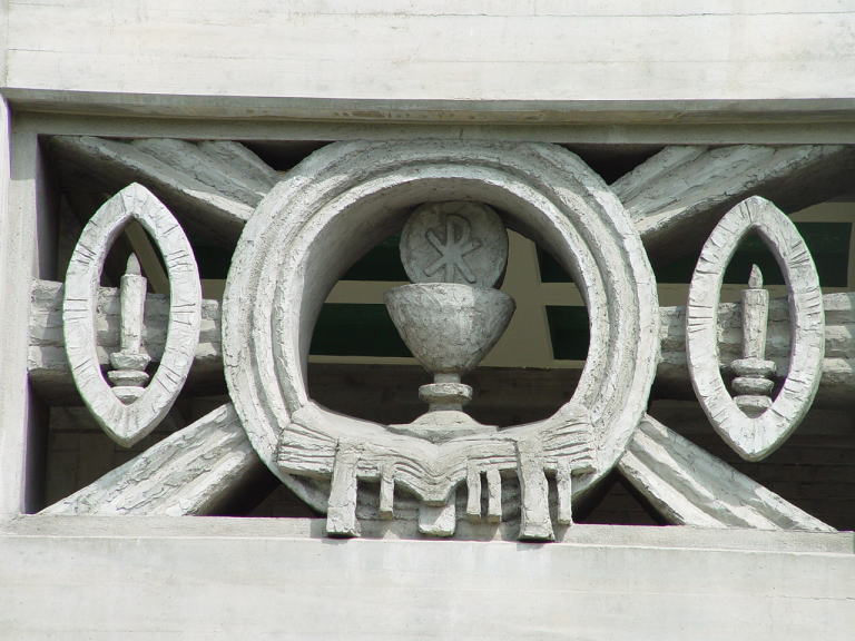 ![]() 聖堂正面の彫刻 “叙階の秘跡” |