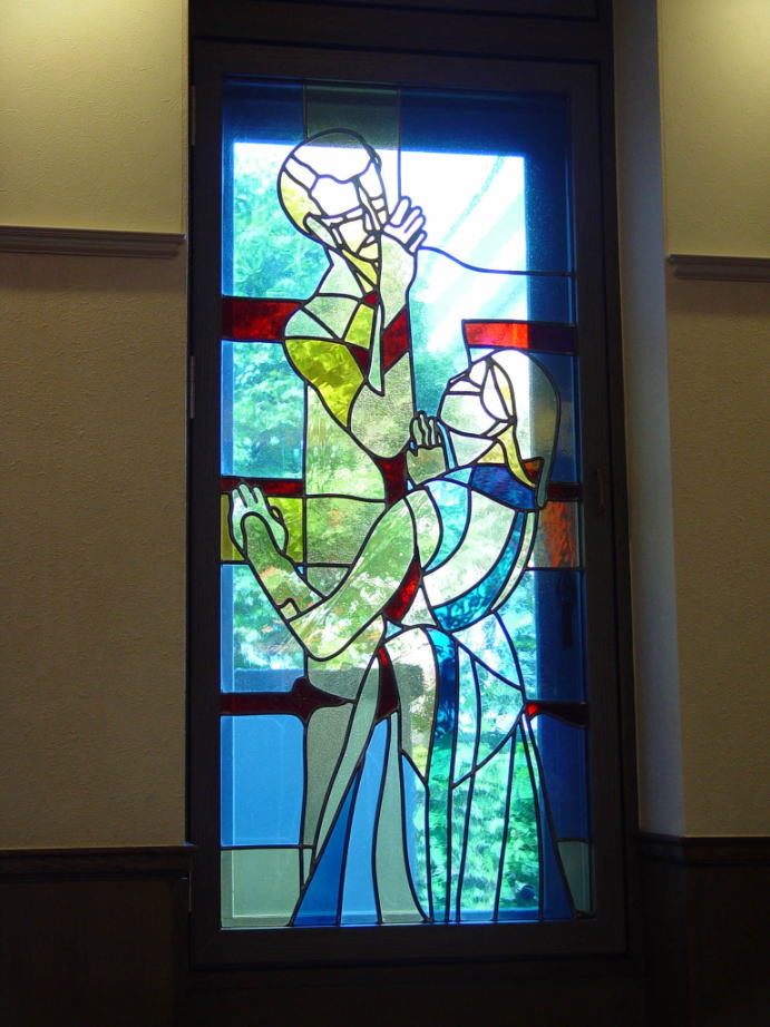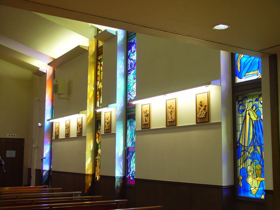 新聖堂には、聖書の物語を織り込んだ美しいステンドグラスが入り、訪れる人びとを聖書の世界へと導いてくれます。