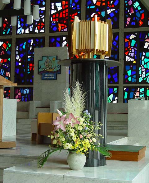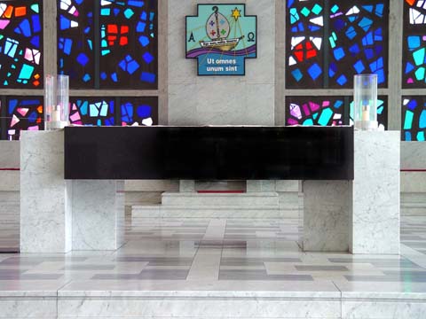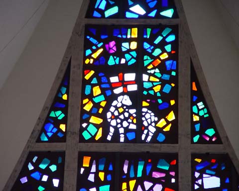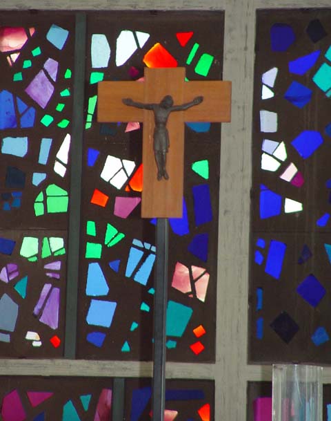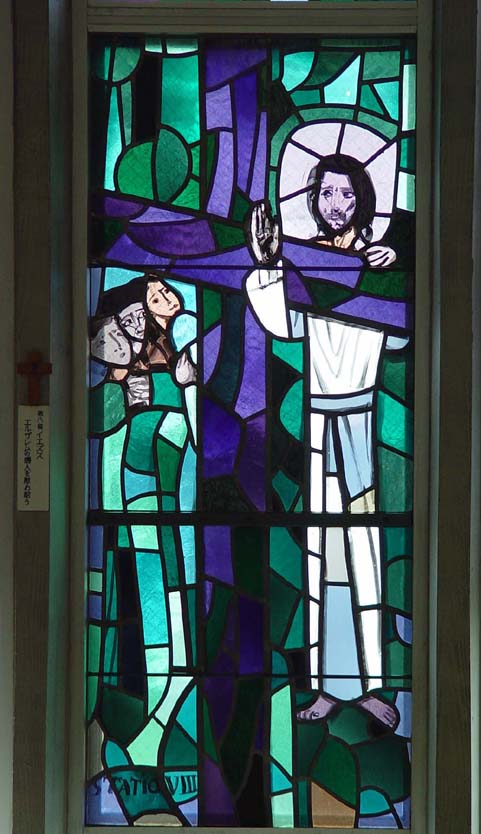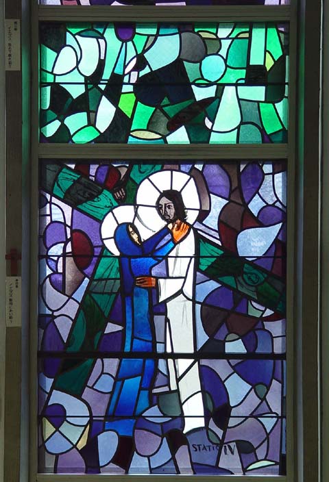 大聖堂のステンドグラスは、ザビエル像と十字架の道行きが描かれ、正面祭壇の後ろを飾る鮮やかなステンドグラスからの光が、聖堂全体を荘厳な輝きにつつんでいます。