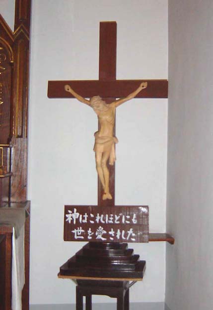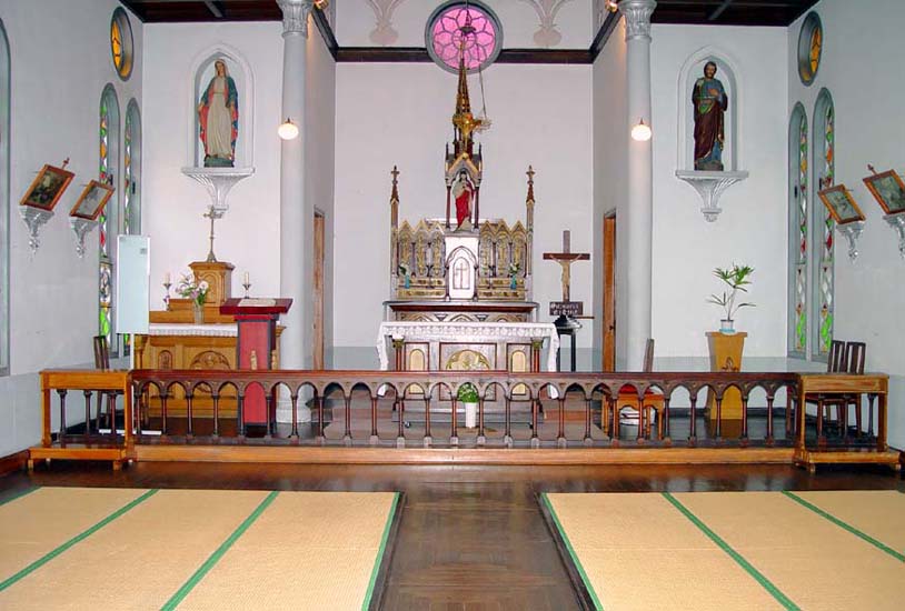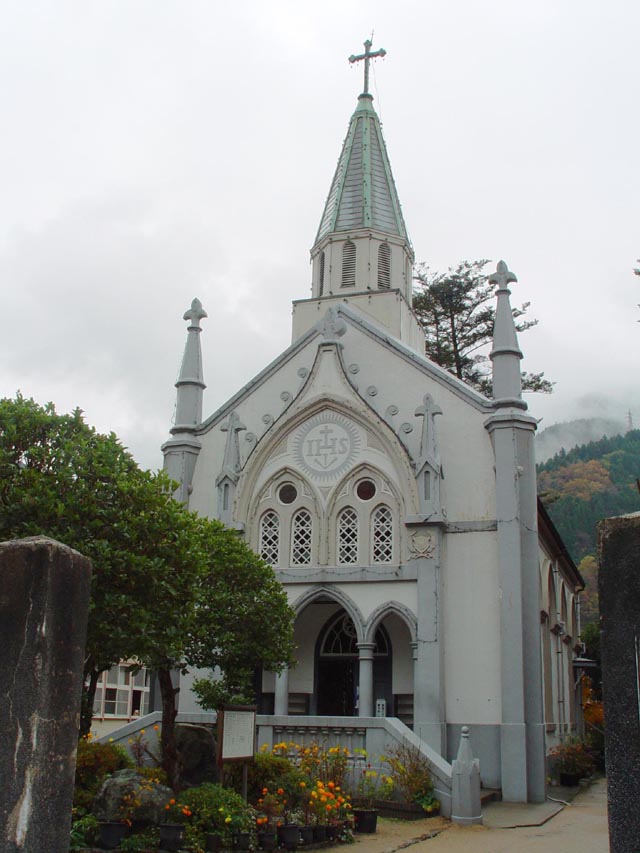 1931(昭和6)年に現在の聖堂が献堂されました。古い城下町とよく調和した石造りの教会で、内部は畳敷きです。この聖堂は、イエズス会のドイツ人司祭パウロ・ネーベル神父によって建てられました。