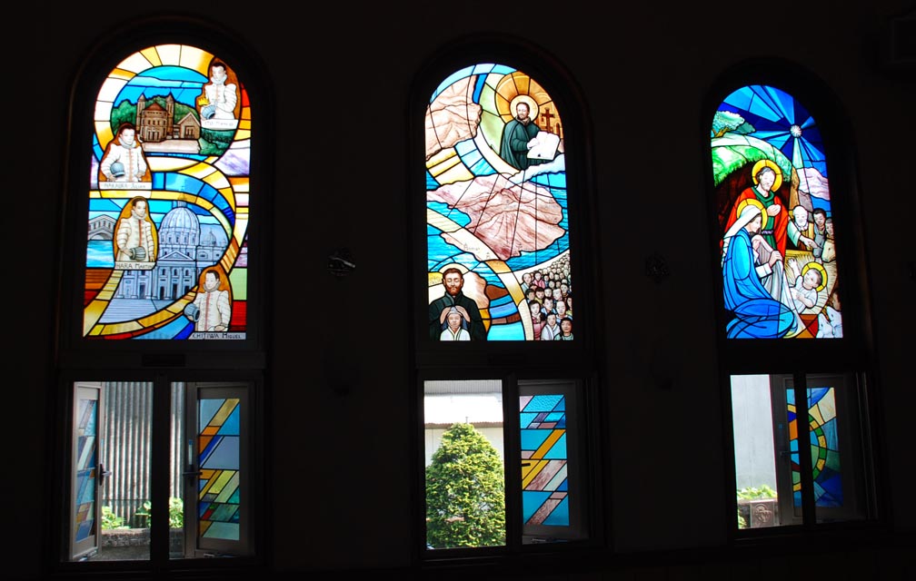 ステンドグラスは、誕生の神秘として「みことばは世に来られた(ベトレヘムでの誕生)」「島原半島に宿り、成長したみことば(アルメイダとヴァリニアーノの使命)」「日本人司祭育成の始まり-有馬のセミナリヨ-地方教会と普遍教会の架け橋となった4人の少年使節」、苦しみの神秘として「ゲッセマネのイエス-試みの教会」「生命の川の岸辺に燃える有馬の8人の殉教者」「お父さん 生贄の子羊はどこにあるのですか(波間に沈む堀内3兄弟殉教)」「証しの山に登る雲仙の殉教者」、復活の神秘として「パンを裂いてくださったときにイエスだとわかった(復活のイエスとの出会い)」が描かれています。