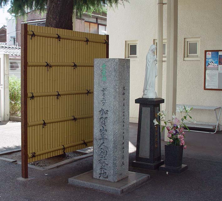 ![]() 教会入口にある ディエゴ加賀山隼人の殉教地の碑 |
