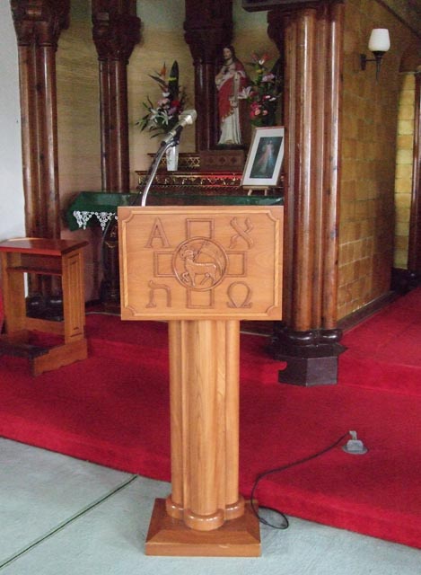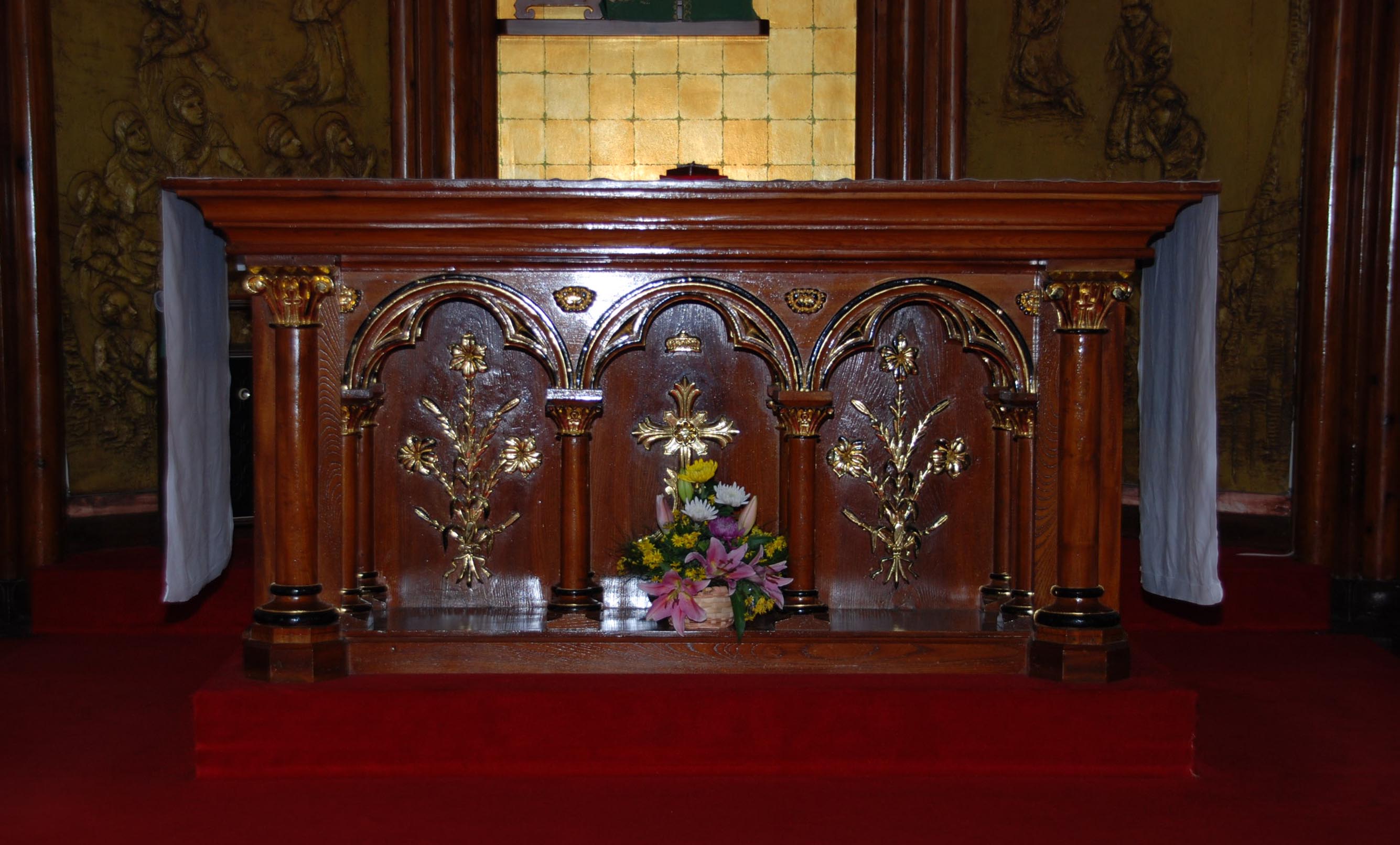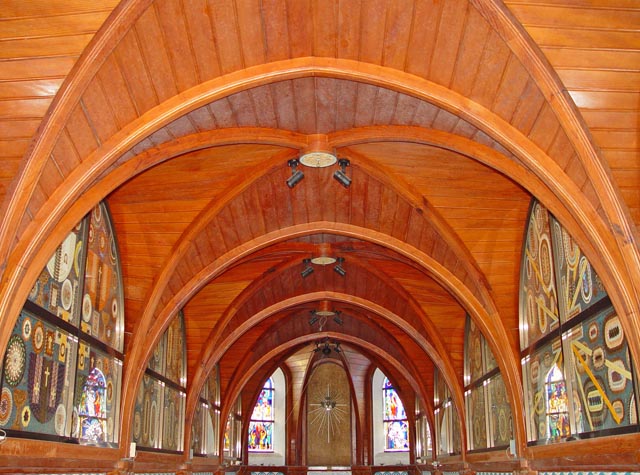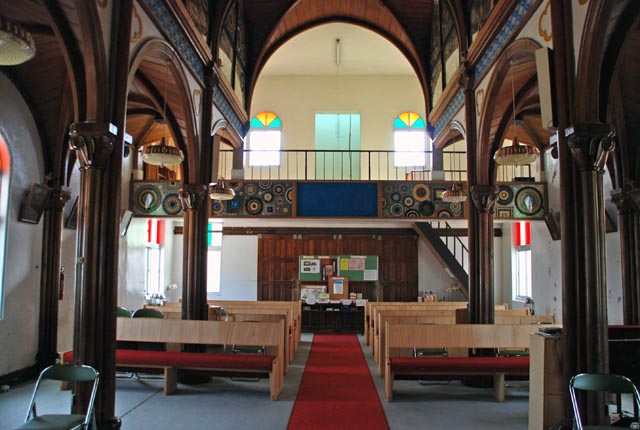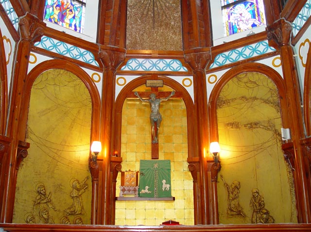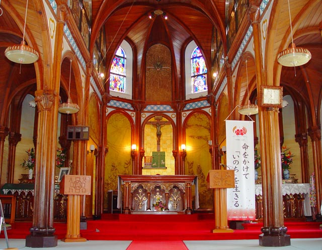 聖堂の天井は木造のリブ ヴォールト天井で、多角形平面の主祭壇と左右脇祭壇があり、シンプルな外観からは想像も付かないほど重厚な趣のロマネスク調の聖堂です。