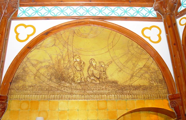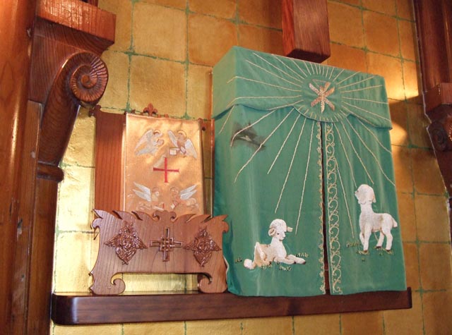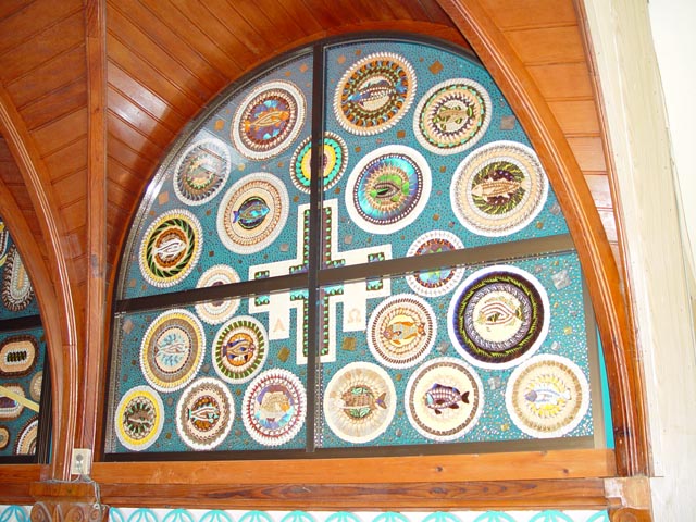壁面には、主任司祭であった烏山神父の手による蝶の羽根で作られた色鮮やかな装飾画が飾られています。この装飾画は「7つの秘跡」を描いたものだそうです。