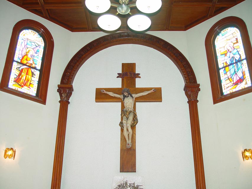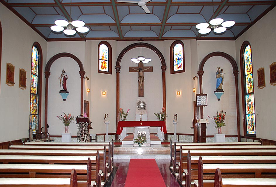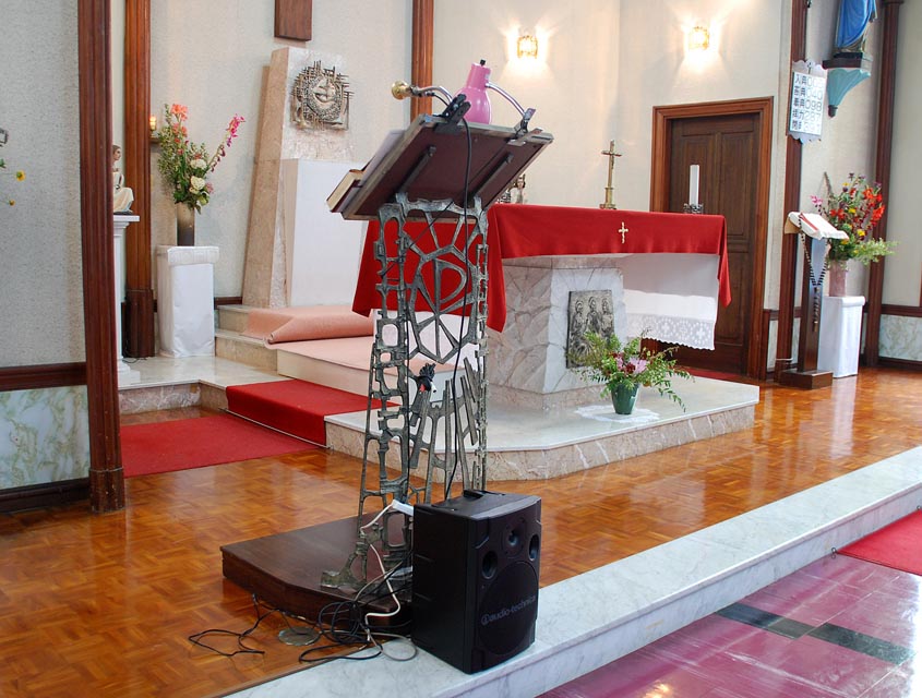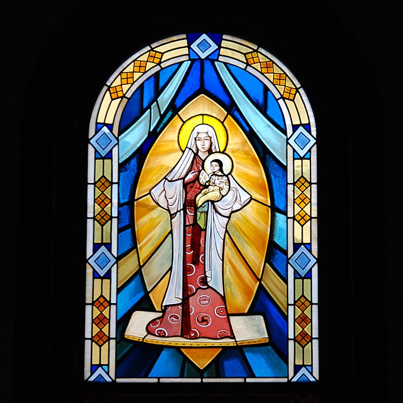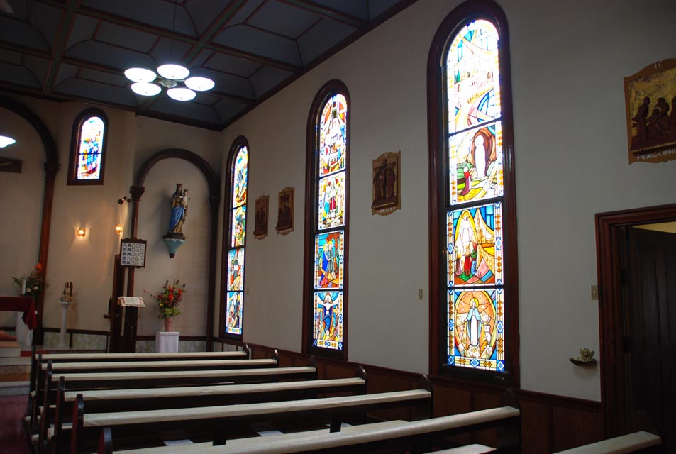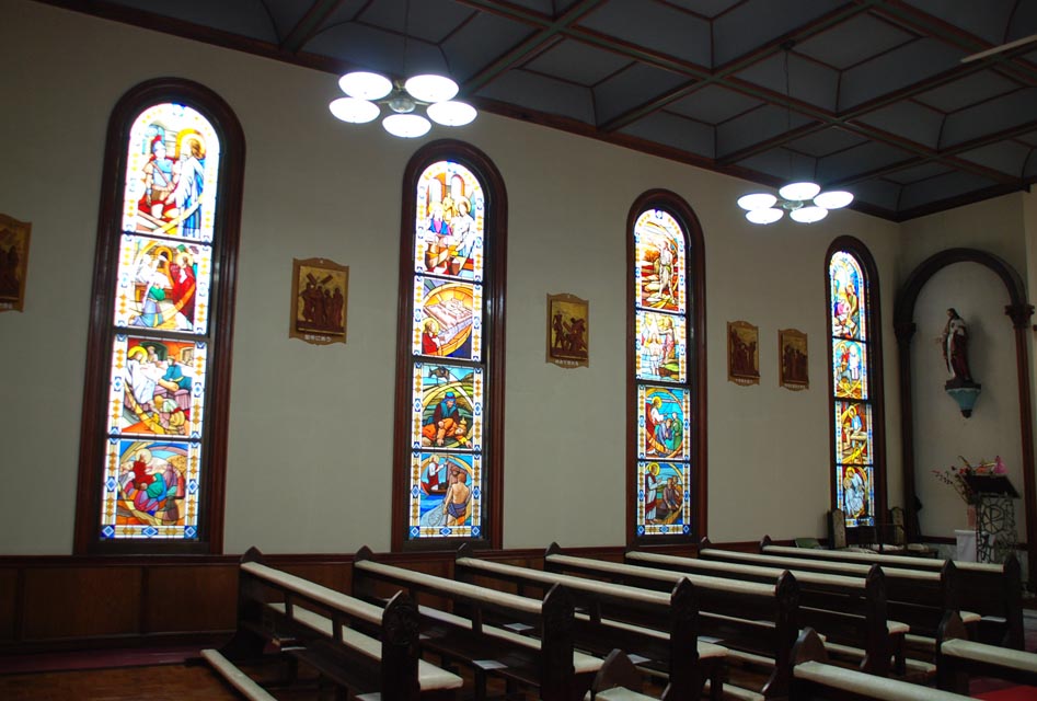 1977年(昭和52)年には、現在の祭壇と十字架の道行きをイタリアより購入し、1982(昭和57)年には、セッキ神父によって、聖堂内の全ての窓ガラス48枚が、イタリアから取り寄せられた色鮮やかなステンドグラスに改築されました。ステンドグラスの絵は、正面上窓に天使とマリアのお告げ、左側は聖書にまつわる聖家族と公的なしるしの場面、右側は中津、大分の宣教に関連する場面と聖マリアの出現、後方は聖ペトロ、ヨハネ、パウロ、サンタマリアの大聖堂などが描かれています。