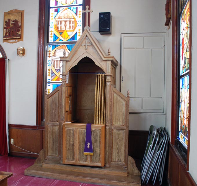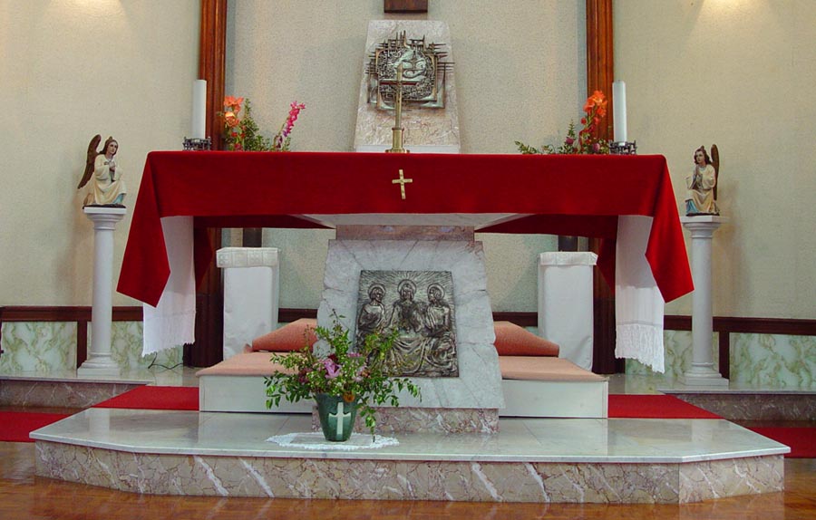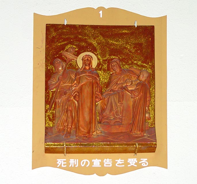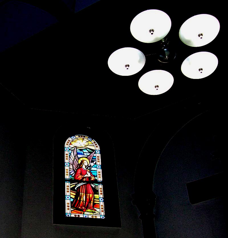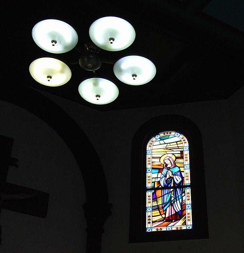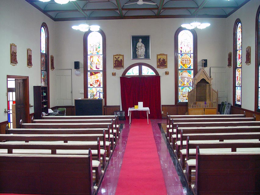 1977年(昭和52)年には、現在の祭壇と十字架の道行きをイタリアより購入し、1982(昭和57)年には、セッキ神父によって、聖堂内の全ての窓ガラス48枚が、イタリアから取り寄せられた色鮮やかなステンドグラスに改築されました。ステンドグラスの絵は、正面上窓に天使とマリアのお告げ、左側は聖書にまつわる聖家族と公的なしるしの場面、右側は中津、大分の宣教に関連する場面と聖マリアの出現、後方は聖ペトロ、ヨハネ、パウロ、サンタマリアの大聖堂などが描かれています。