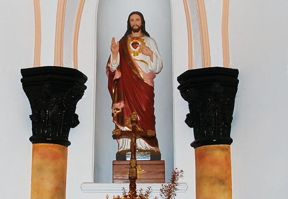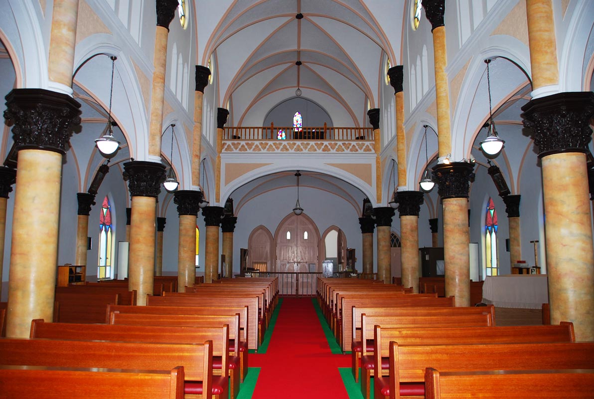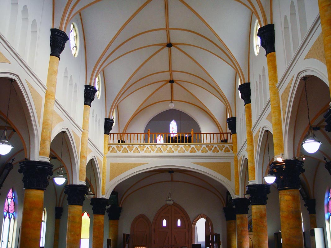 鉄筋コンクリート造りで、正面中央に巨大な尖塔と小尖塔が林立しています。白を基調とした内部平面は三廊式で、壁や柱には、マーブル模様の伝統的な漆喰塗りの技法が彫刻が施されています。天井はリブ・ヴォルト(コウモリ)天井で、聖堂内にはステンドグラスをとおしてやさしく美しい光が差し込みます。