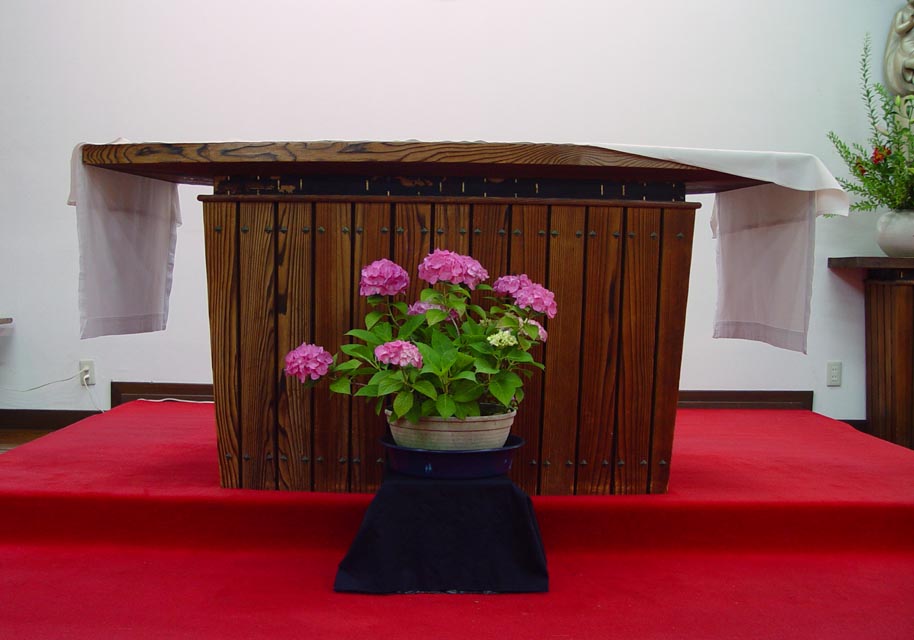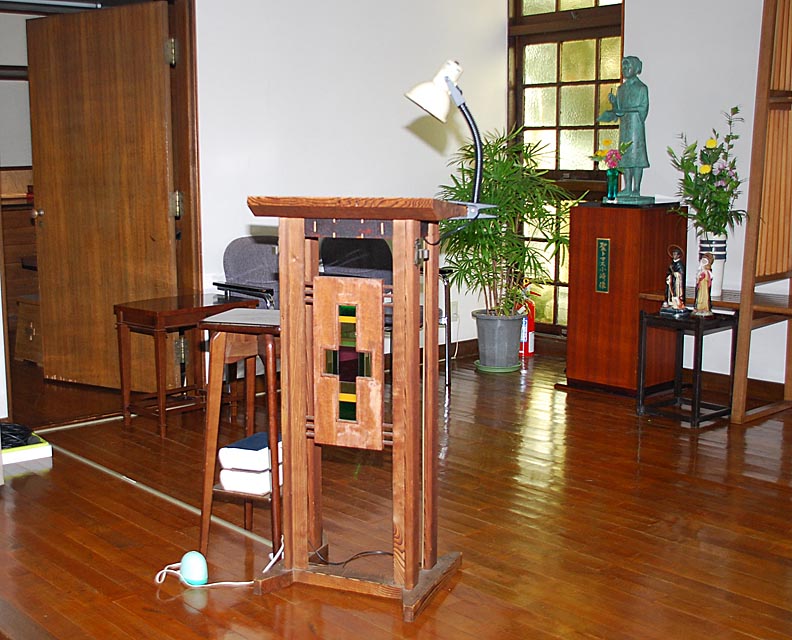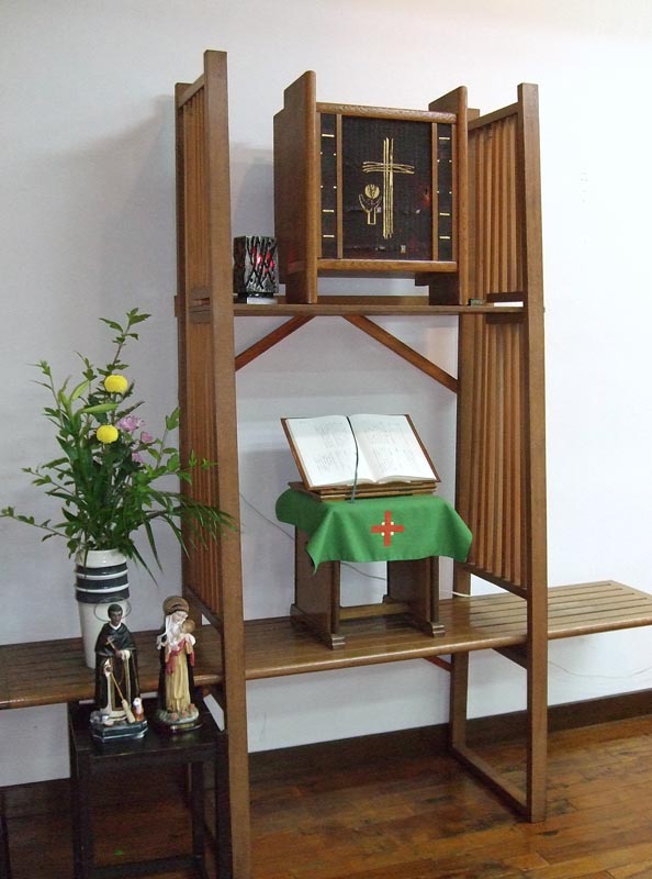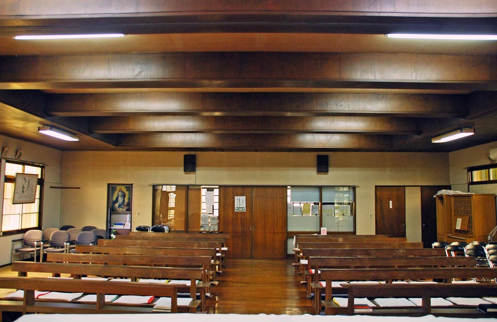 翌年3月にド・ラ・ペリエール神父が初代主任司祭として着任し、祭壇を舟屋町から保育所の1室に移しました。10月には東町の元酒倉を借りて、聖堂に改造し、「王たるキリストの教会」をしました。