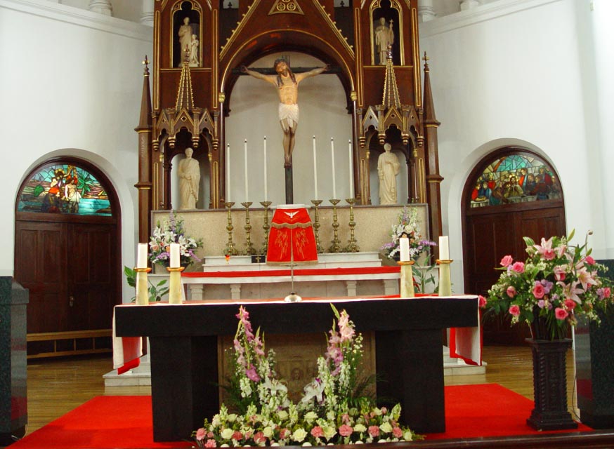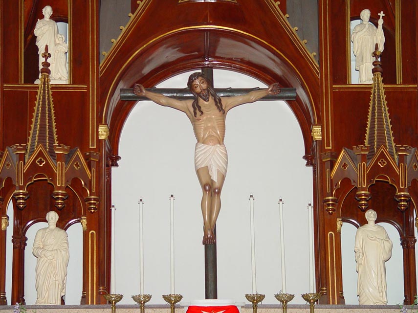 フランシスコ・ザビエルが生まれた時から接し信仰の原点としていた「ほほえみの十字架」と呼ばれる十字架が、スペイン・バスク地方のザビエル城に安置されています。中町教会聖堂の十字架は、この十字架のレプリカです。2004(平成16)年4月4日の受難の主日に、髙見三明大司教により、祝福(奉納)されて祭壇中央に安置されました。