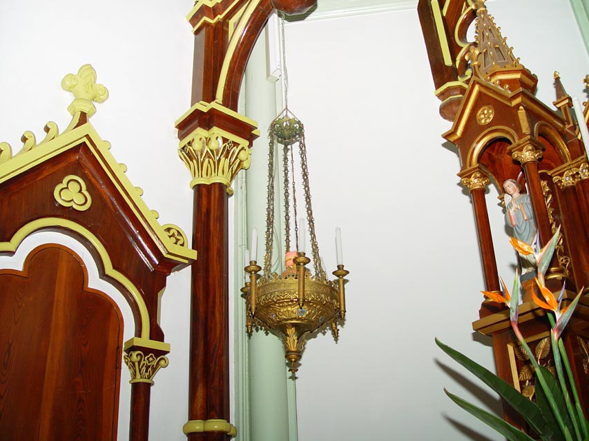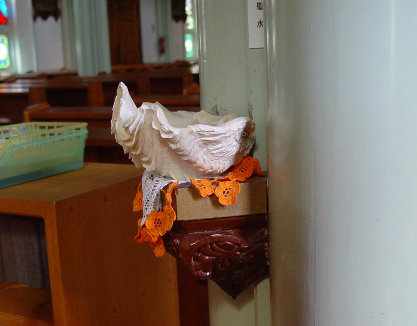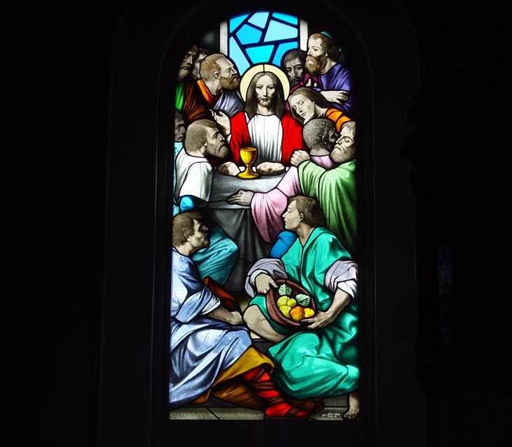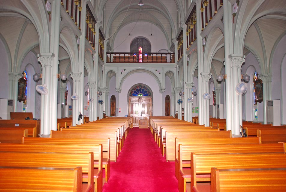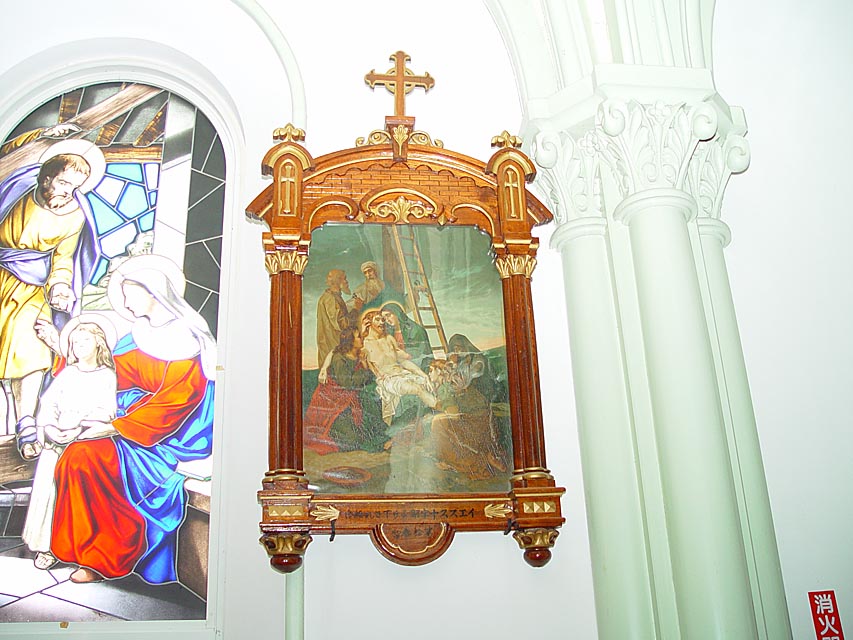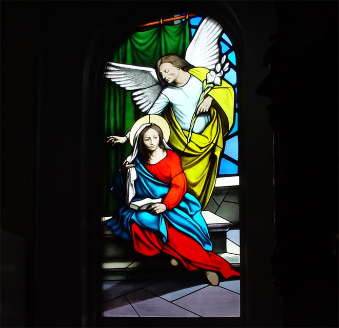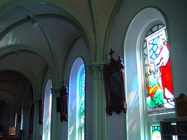 アンジェラスの鐘はフランスから取り寄せたもので、聖書の物語を描いたイタリア製のステンドグラスが聖堂内をやさしい光で包んでいます。