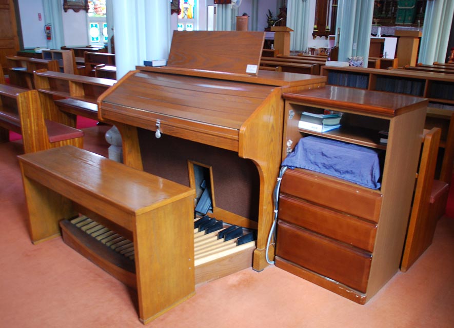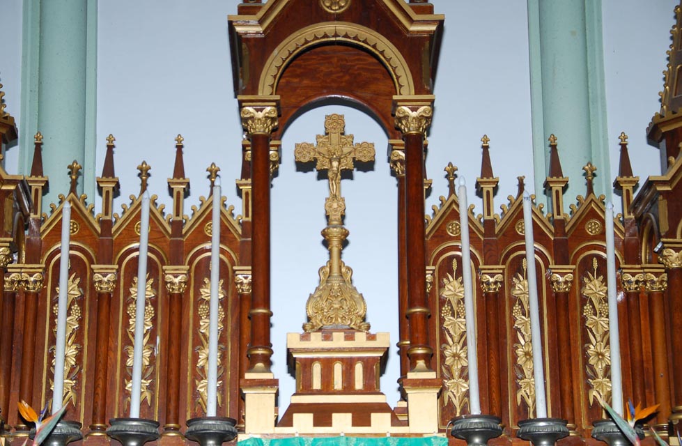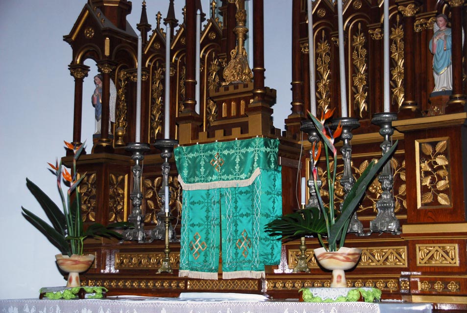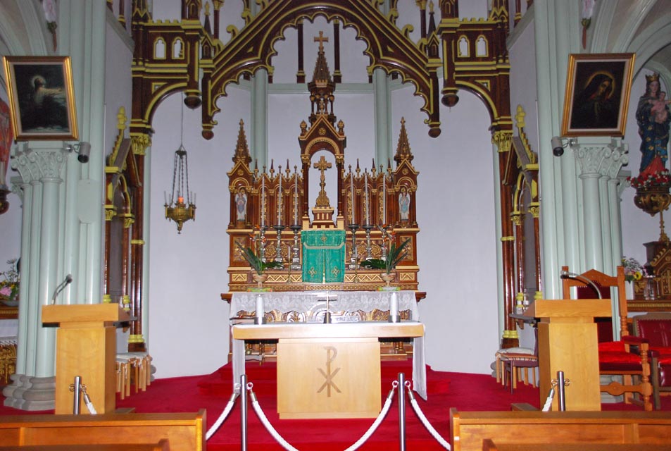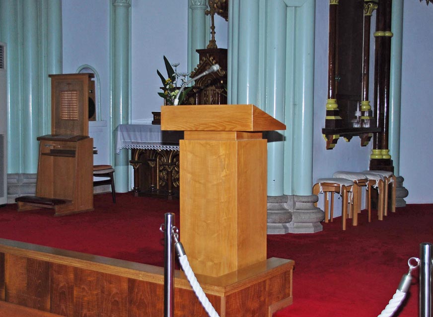 アンジェラスの鐘はフランスから取り寄せたもので、聖書の物語を描いたイタリア製のステンドグラスが聖堂内をやさしい光で包んでいます。