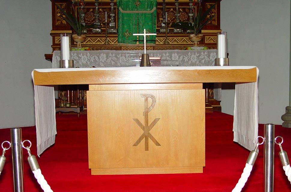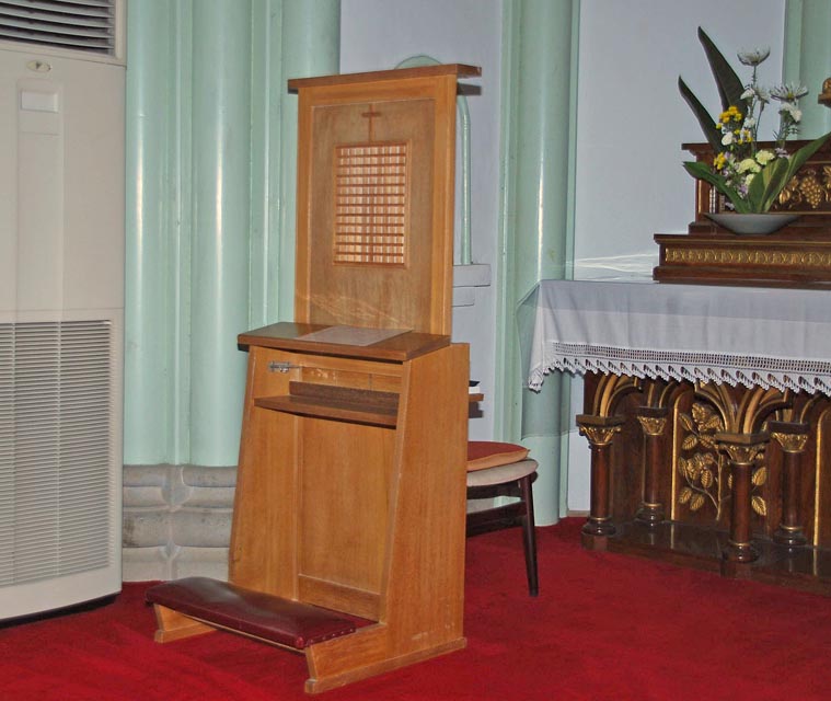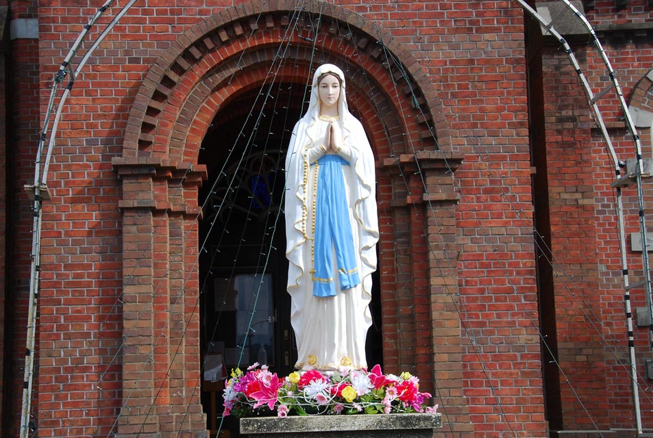 1915(大正4)年から1918(大正7)年まで3年をかけて、中田藤吉神父の指導のもと赤煉瓦造りの八角形ドームを持つ重層屋根構成の聖堂が完成しました。設計施工は、九州の多くの聖堂建築にたずさわった「教会建築の父」といわれる鉄川与助氏によるものです。
