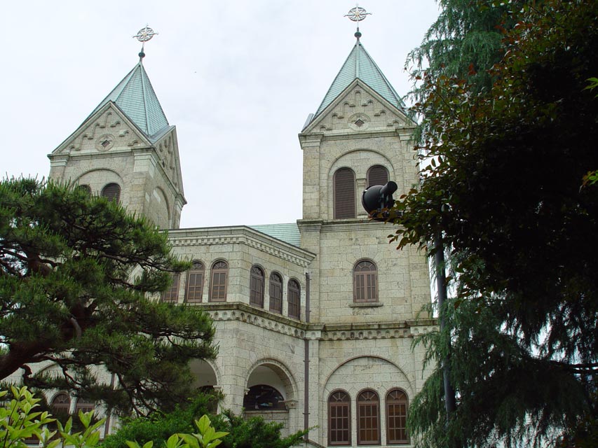 1910(明治43)年に最初の聖堂が建てられ、現在もその石壁の一部が残されています。
