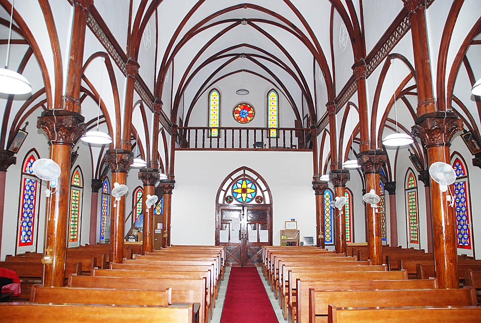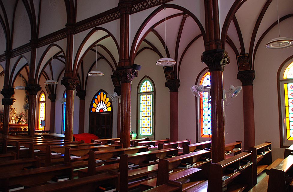 1910(明治43)年に献堂され国重要文化財にも指定されている現聖堂は、3代目の聖堂です。鉄川与助氏によって設計施工されたこの聖堂の内部は、三廊式で主廊部、側廊部とも漆喰仕上げで、四分割リブ・ヴォールト(コウモリ)天井、尖塔アーチのゴシック様式です。煉瓦を積み上げて造られた外壁の煉瓦は、信徒が総出で煉瓦を運びあげたものです。