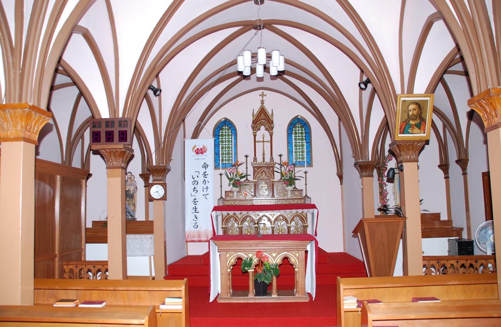 1907(明治40)年に、現在の聖堂が建てられました。設計施工は、冷水出身の鉄川与助氏でした。氏は、当時27歳。はじめて自ら設計施工した教会です。