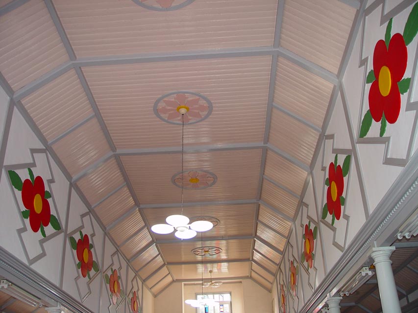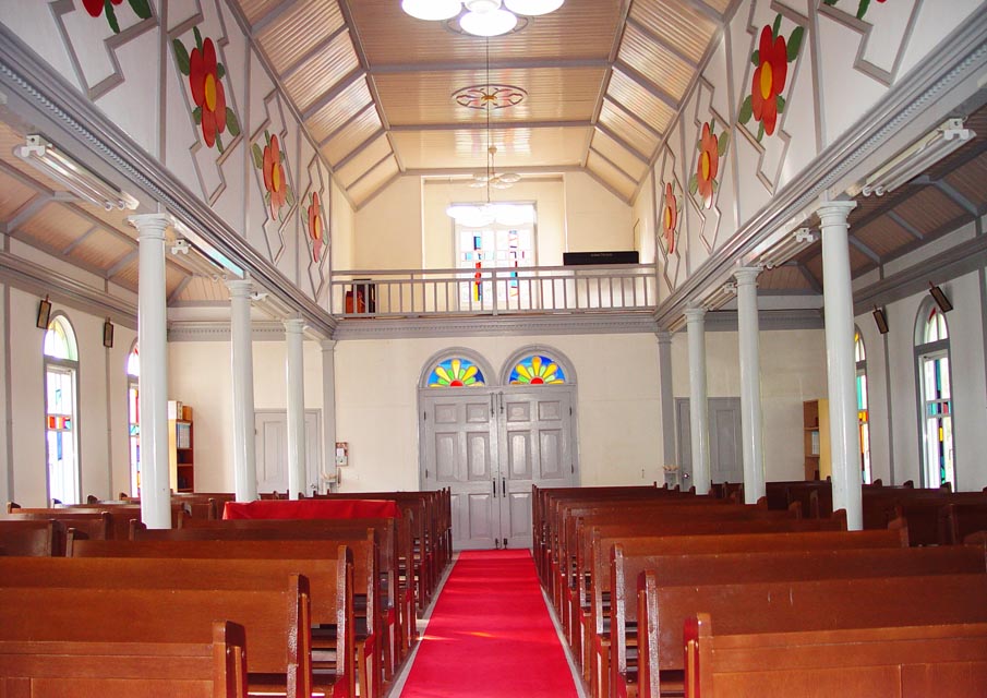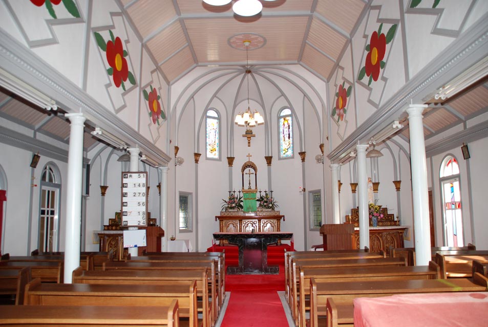 その内部は、構造は三廊式で、折り上げ天井となっています。