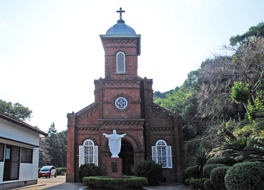 1879(明治12)年に、現在の教会から少し西方に位置する小字浦迫に木造の教会が建てられました。1915(大正4)年、現在のレンガ造りの天主堂が完成し、旧聖堂は若松島の土井ノ浦に移築されました。