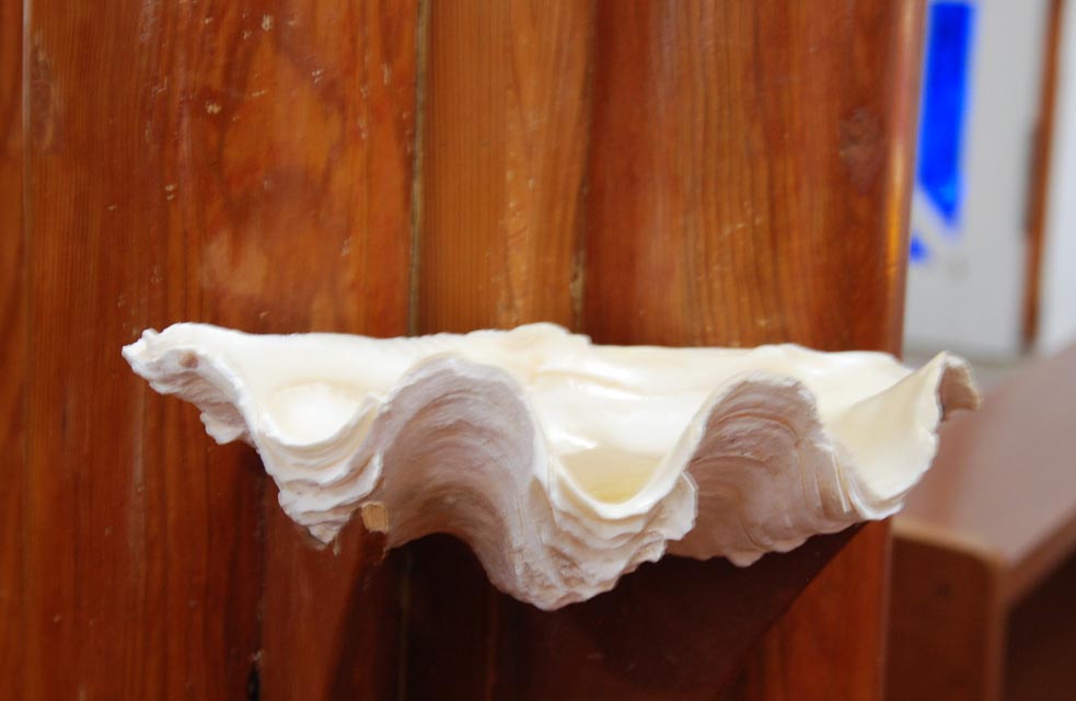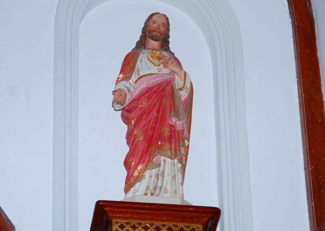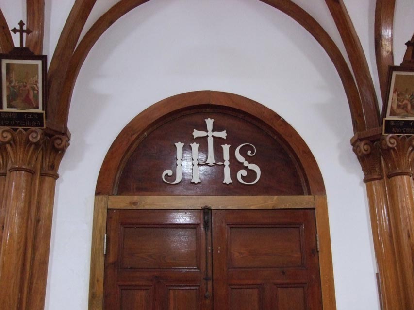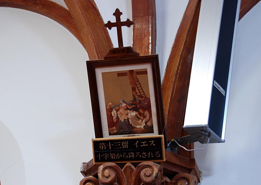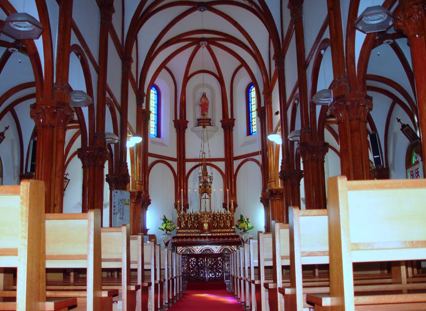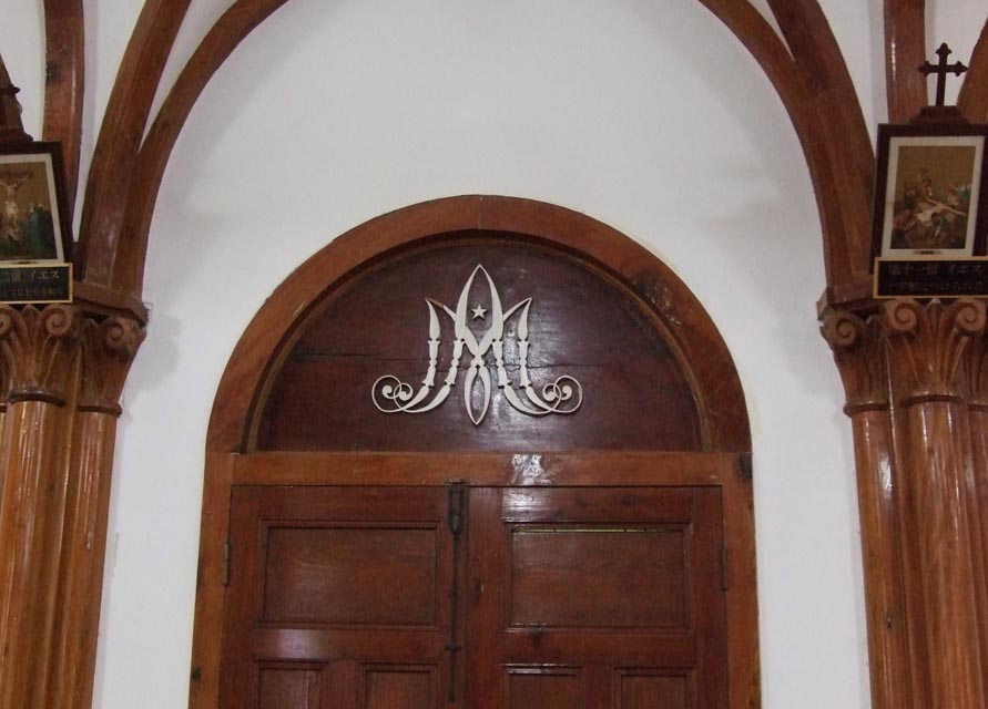 現在の聖堂の施工は、長崎の多くの教会建設に携わった五島出身の鉄川与助氏で、柱頭の彫刻は鉄川氏の父・与四郞氏によります。