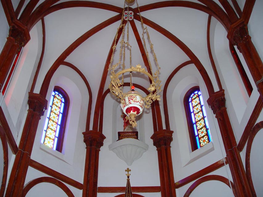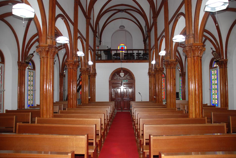 聖堂内部は3廊式で、主廊部・側労部ともに漆喰仕上げ4分割コウモリ天井で造られています。