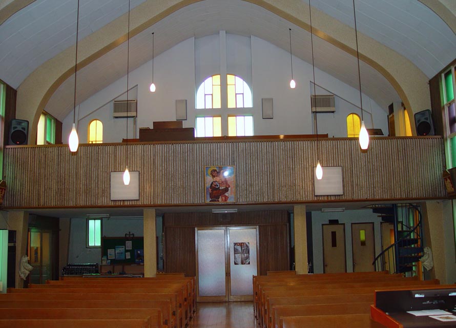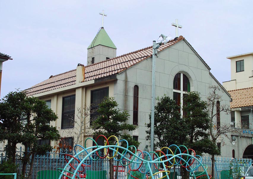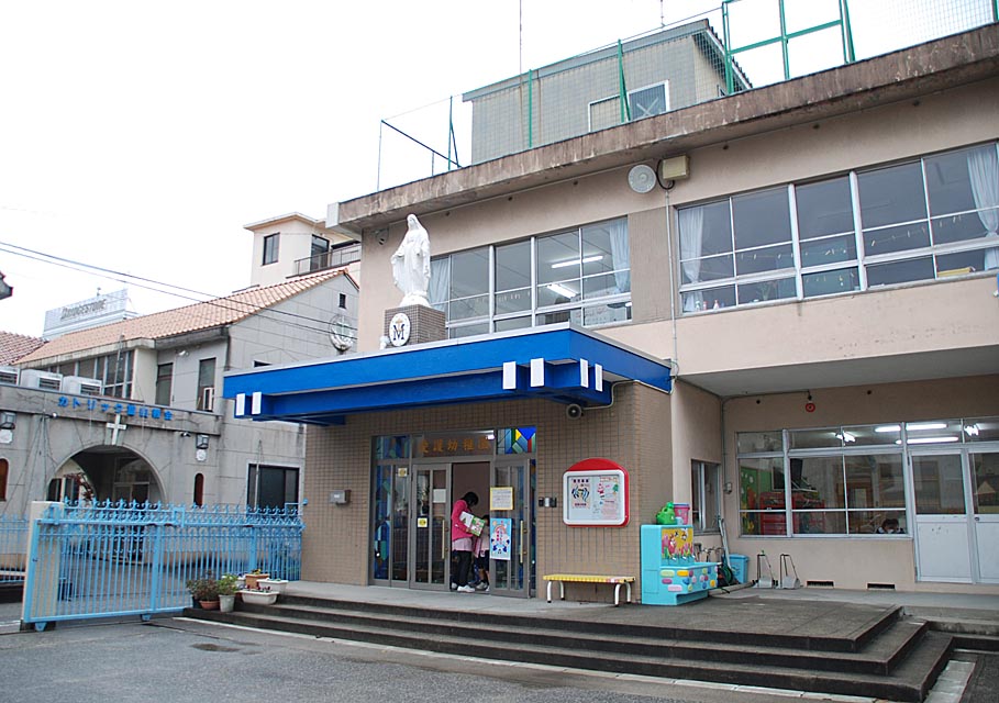 富山市中心部の繁華街の路地を少し入った所に位置し、向かい側には教会付属の愛護幼稚園があります。