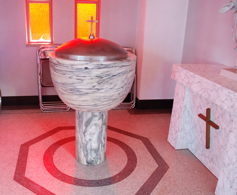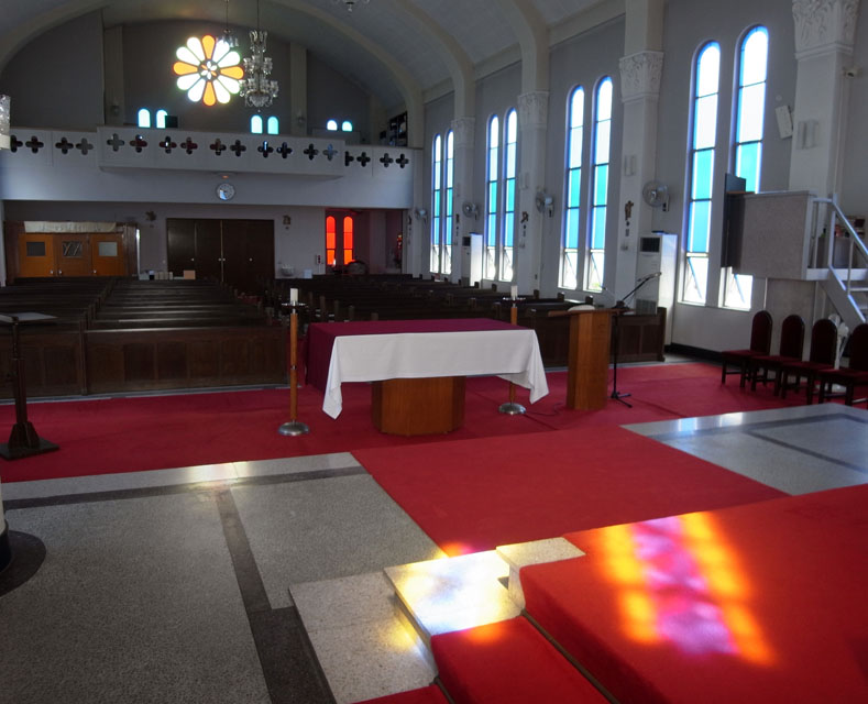 1947(昭和22)年に、市から現在地を譲渡され、1950(昭和25)年には仮聖堂兼司祭館が設置されました。