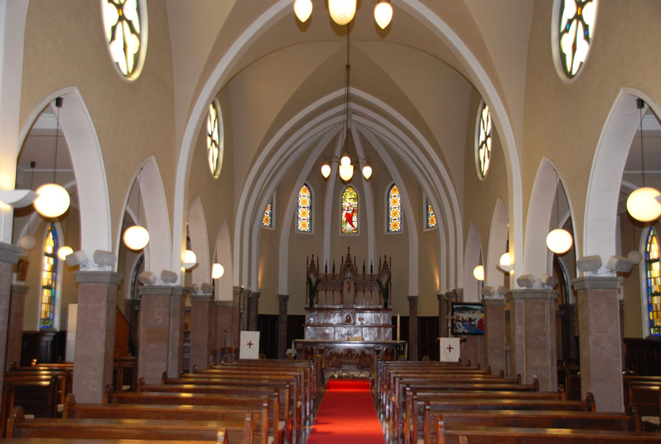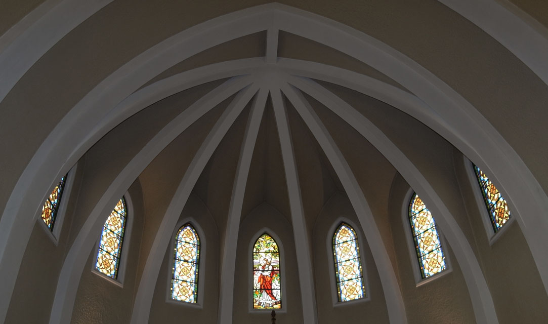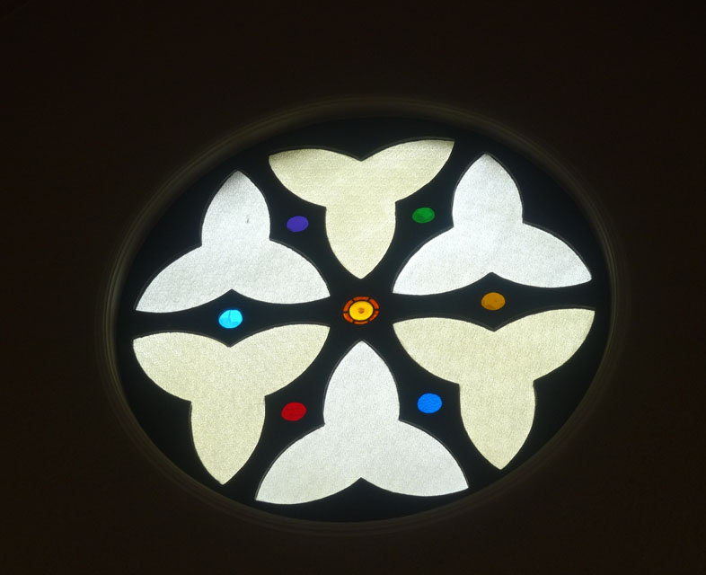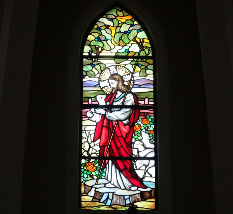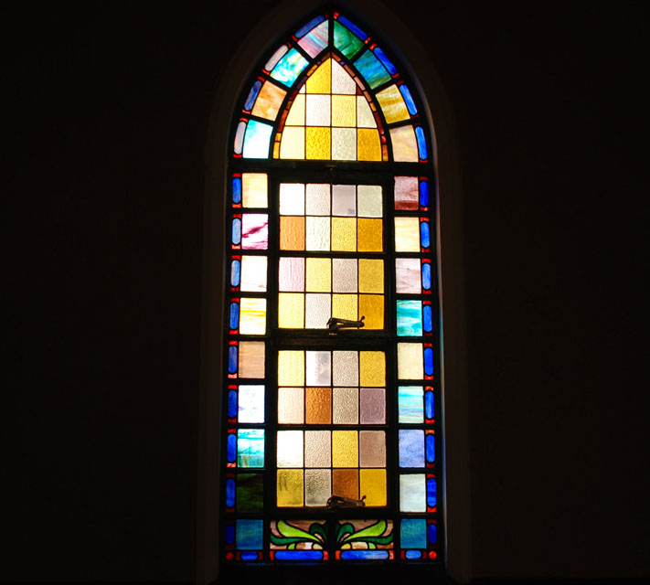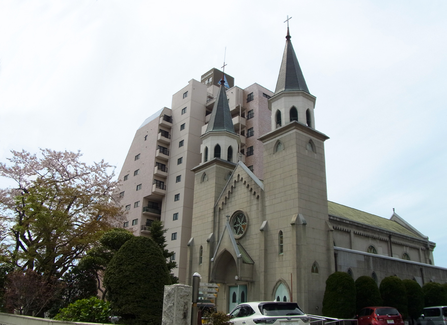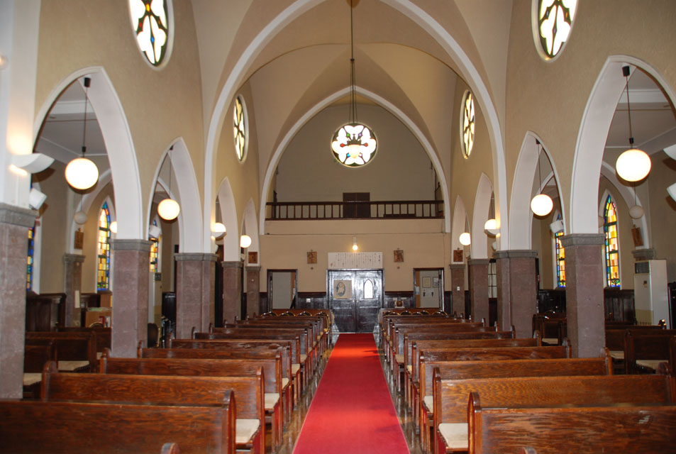 1932(昭和7)年に現在の聖堂が建てられ11月に献堂式が行われました。この聖堂は、鉄筋コンクリート造りの3階建ての尖塔アーチを持つゴシック様式の建物で、ステンドグラスはアメリカ製のオパールセントグラスの乳白ガラスの一つです。