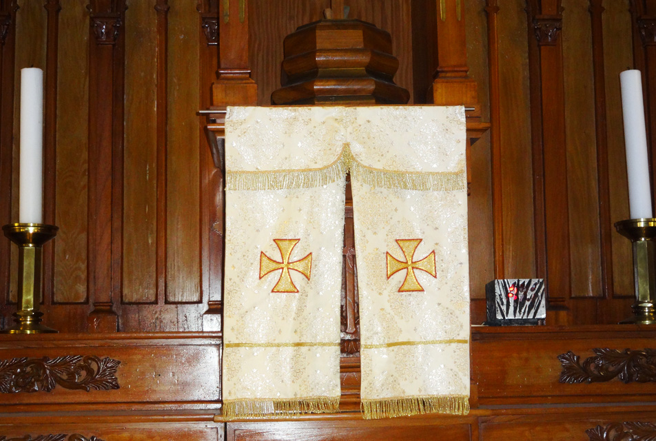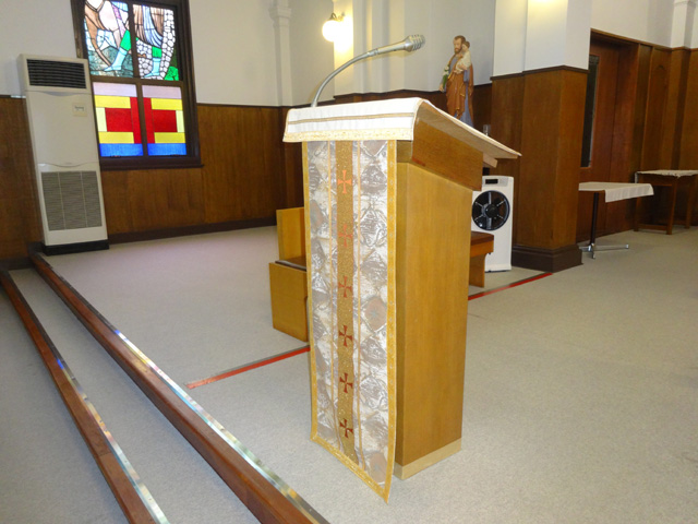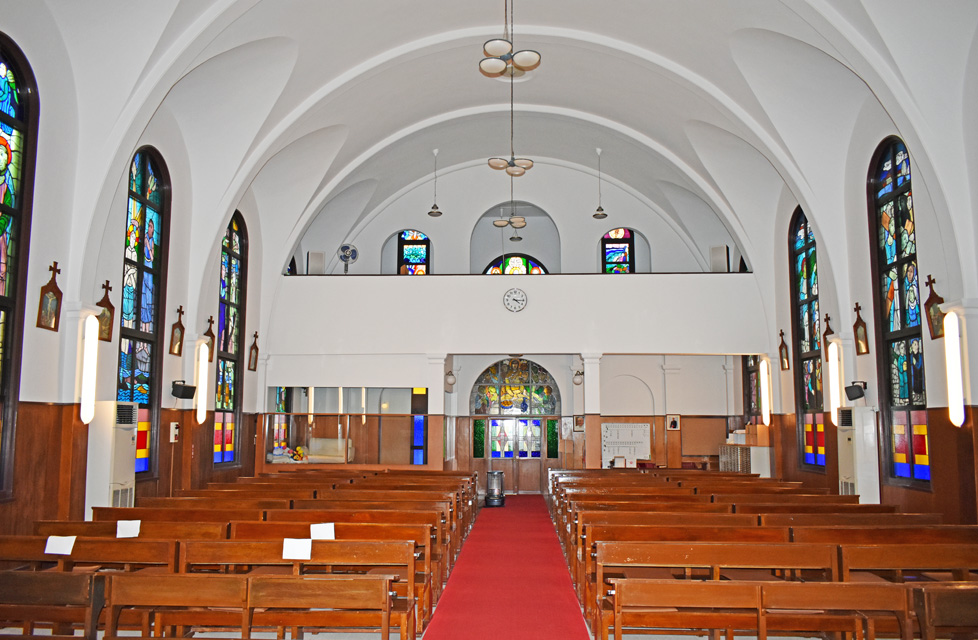 ヴォールト様式の漆喰天井を持ち、両翼に柱がない大変珍しい木造建築物です。ゴシィック式祭壇と長椅子は聖心聖堂時代のものです。