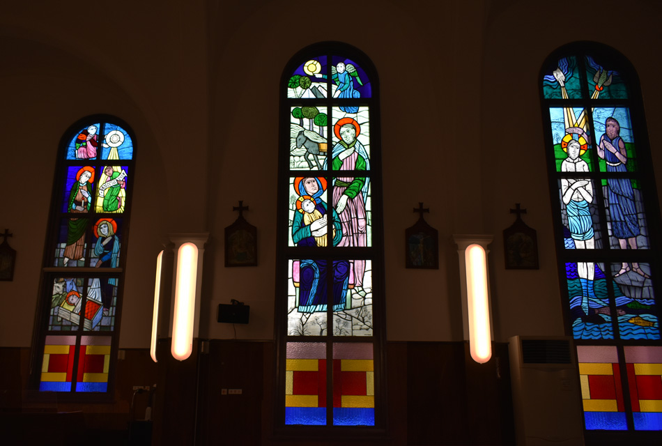 1996(平成8)年、当時の主任司祭青木保師がドミニコ会のカルペンティール神父に依頼し、現在のステンドグラスが設置されました。