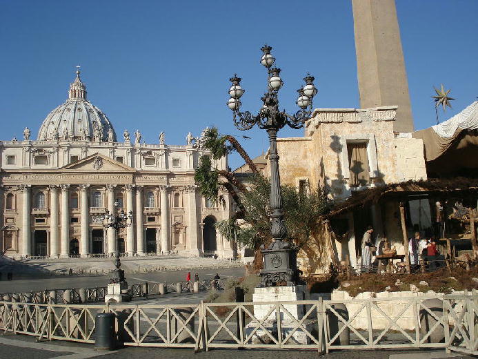 サン・ピエトロを訪れたのは1月30日。とてもお天気のよい日で、春のような日差しでした。バスを降りて、回廊を抜け、広場に入ると……。「おや、あれは何だ?」広場の中央に小屋のようなものが建っていました。おまけにクリスマスツリーのようなキラキラしたもみの木が……。正面にまわってみると、なんとクリスマスの馬小屋でした。